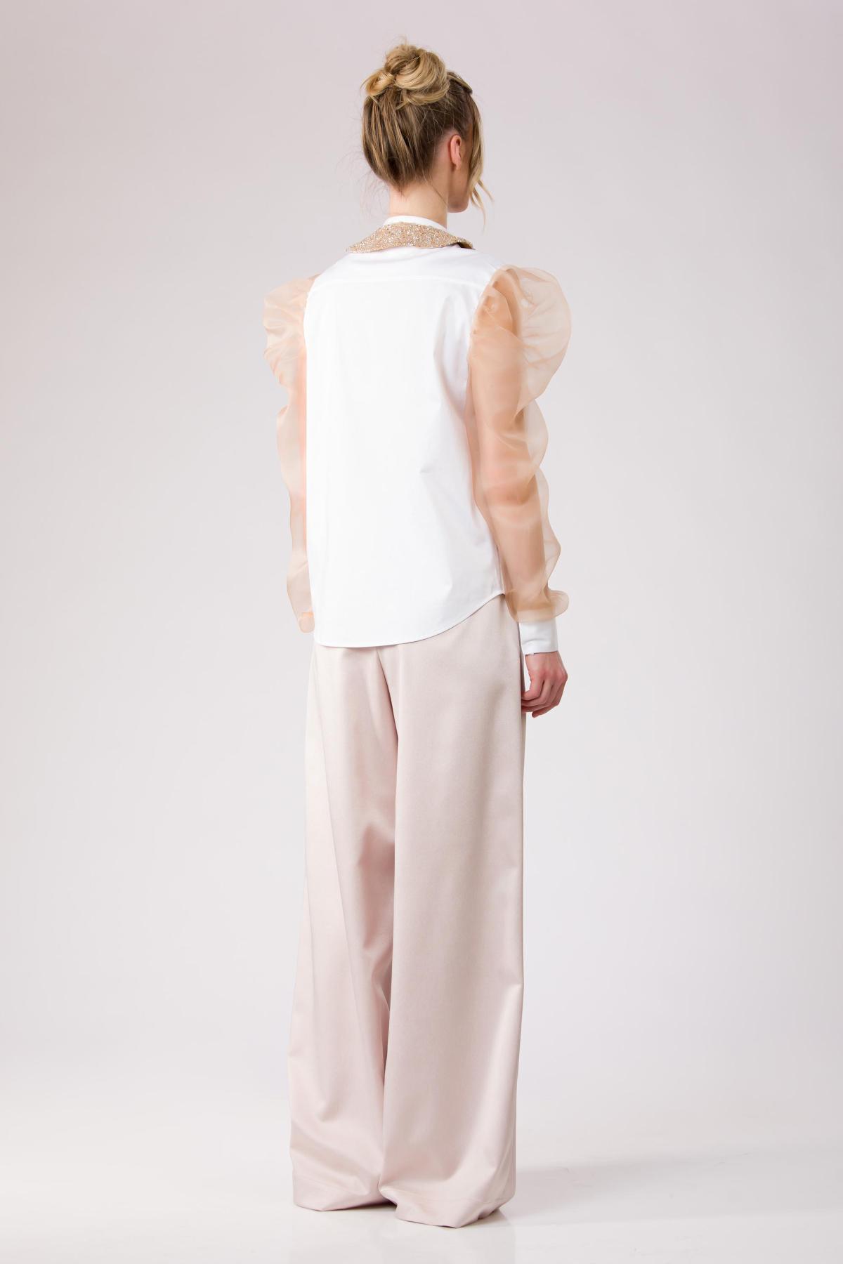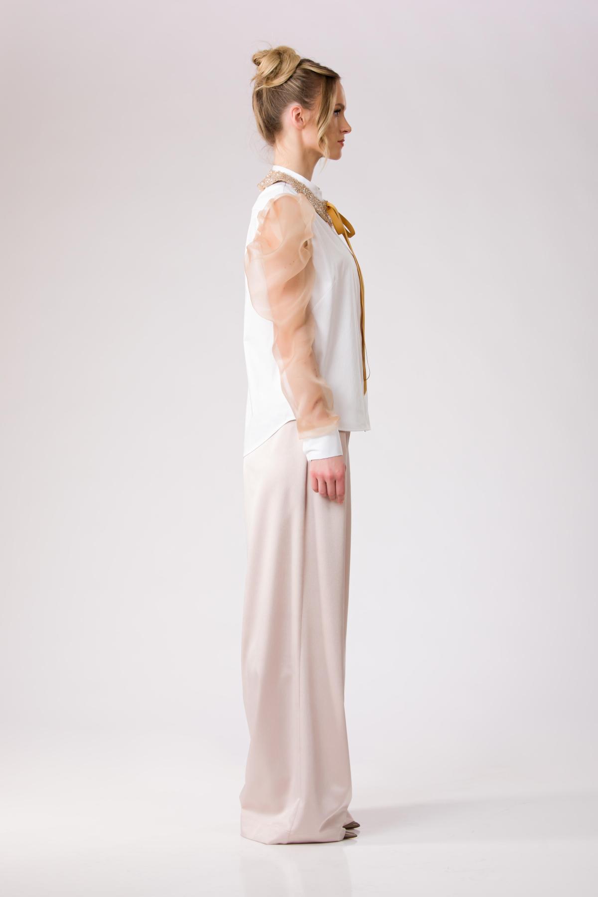 Bluza Odette imbina rafinamentul clasic cu detalii couture, fiind realizata din bumbac premium, cu maneci spectaculoase din organza translucida. Volumul delicat al manecilor creeaza o linie sculpturala, in timp ce gulerul brodat manual, cu efect stralucitor, adauga o nota pretioasa piesei. Panglica satinata aurie completeaza designul, accentuand eleganta feminina a modelului.