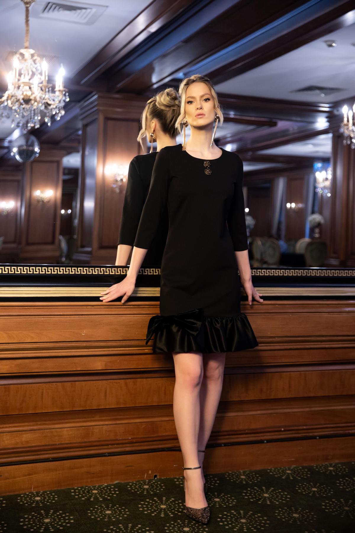 Rochia Dominique este realizata din punto elastic de calitate superioara, care se aseaza impecabil pe silueta si ofera confort pe durata intregii zile. Volanul din matase satinata, dispus la baza rochiei, adauga miscare si o nota couture, iar funda ampla din catifea de matase creeaza un accent feminin, sofisticat si modern. Linia simpla a rochiei este echilibrata de detaliile elaborate, ceea ce o transforma intr-o piesa versatila pentru evenimente, cocktail-uri sau tinute elegante de seara. Nasturii pretiosi sunt made in Italy.