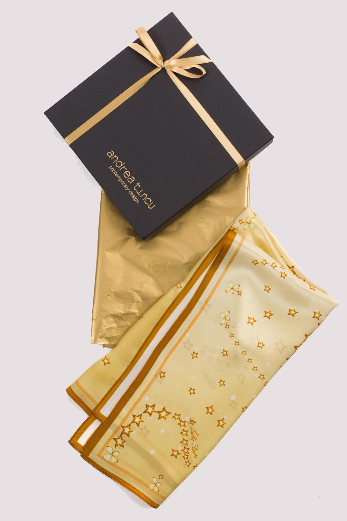 Fiecare esarfa este livrata in cutie neagra personalizata si ambalata in hartie aurie de matase.La cerere, se poate adauga felicitare si se poate imprima cu numele sau initialele dorite.