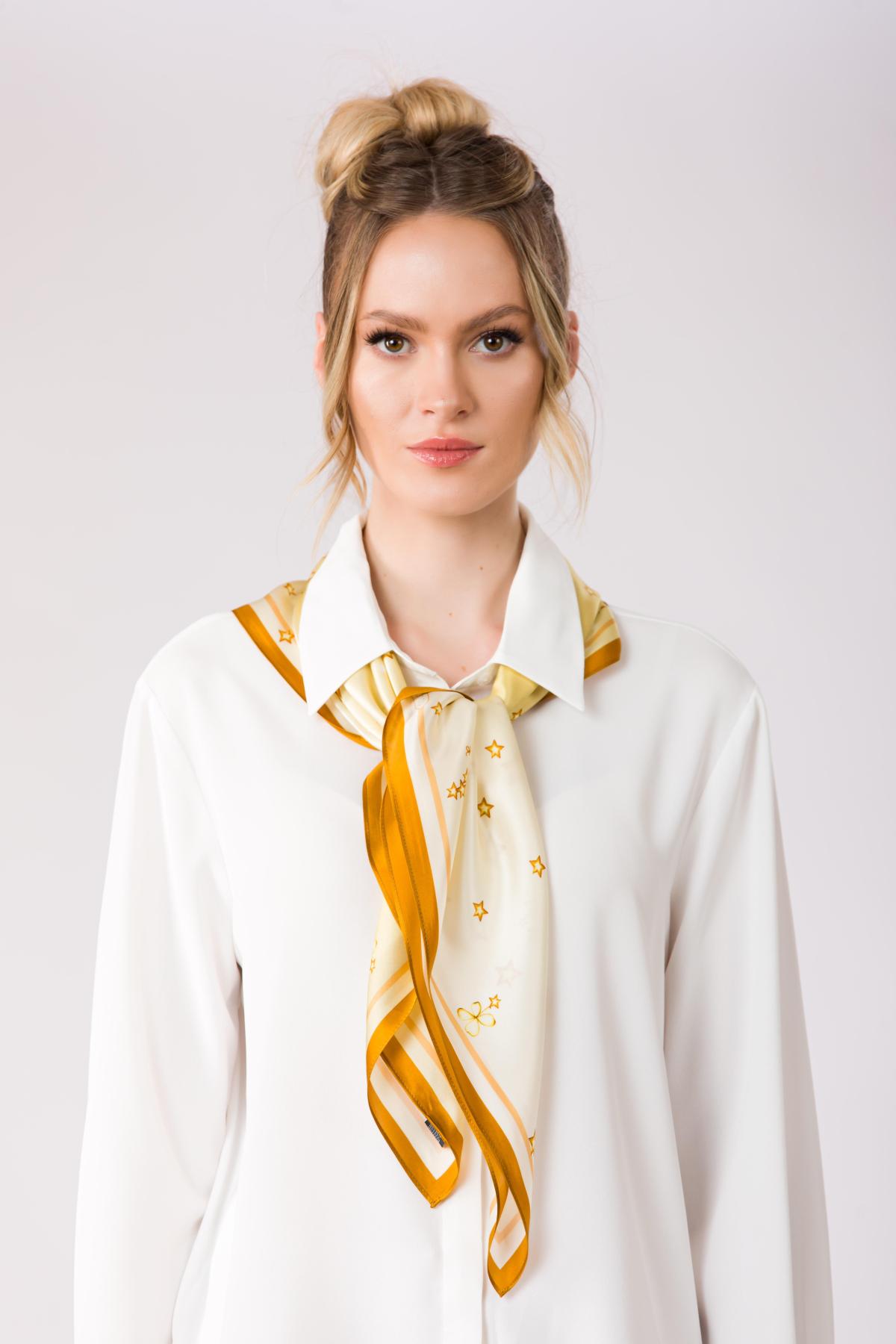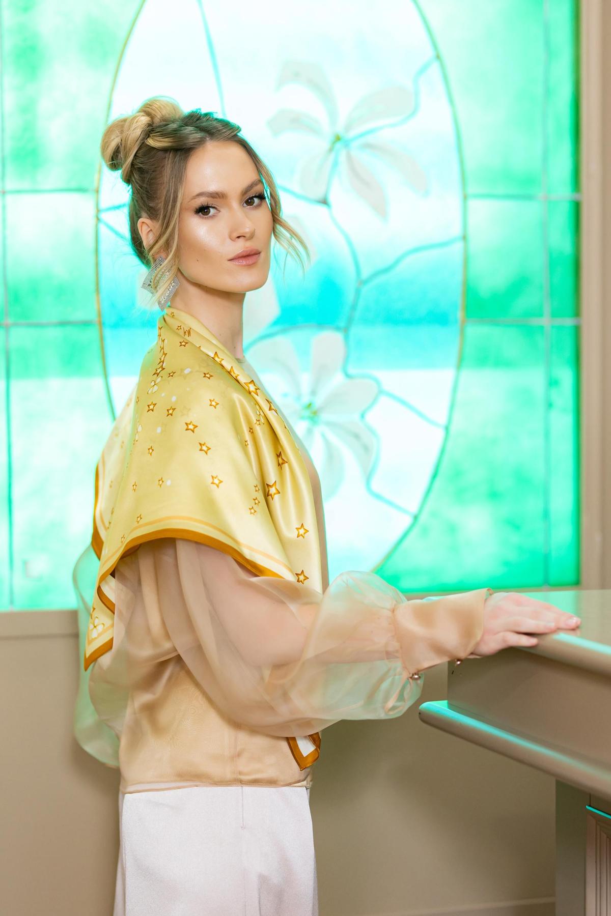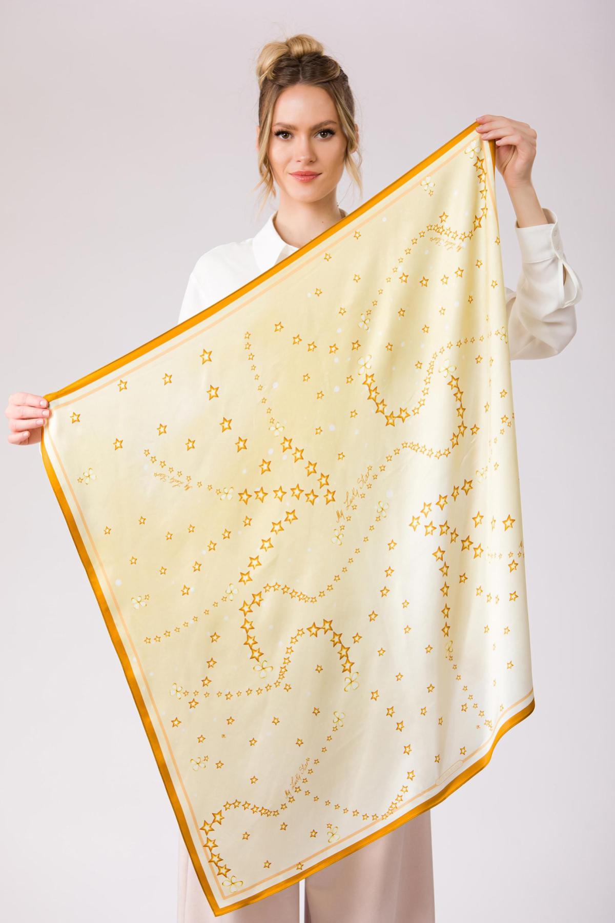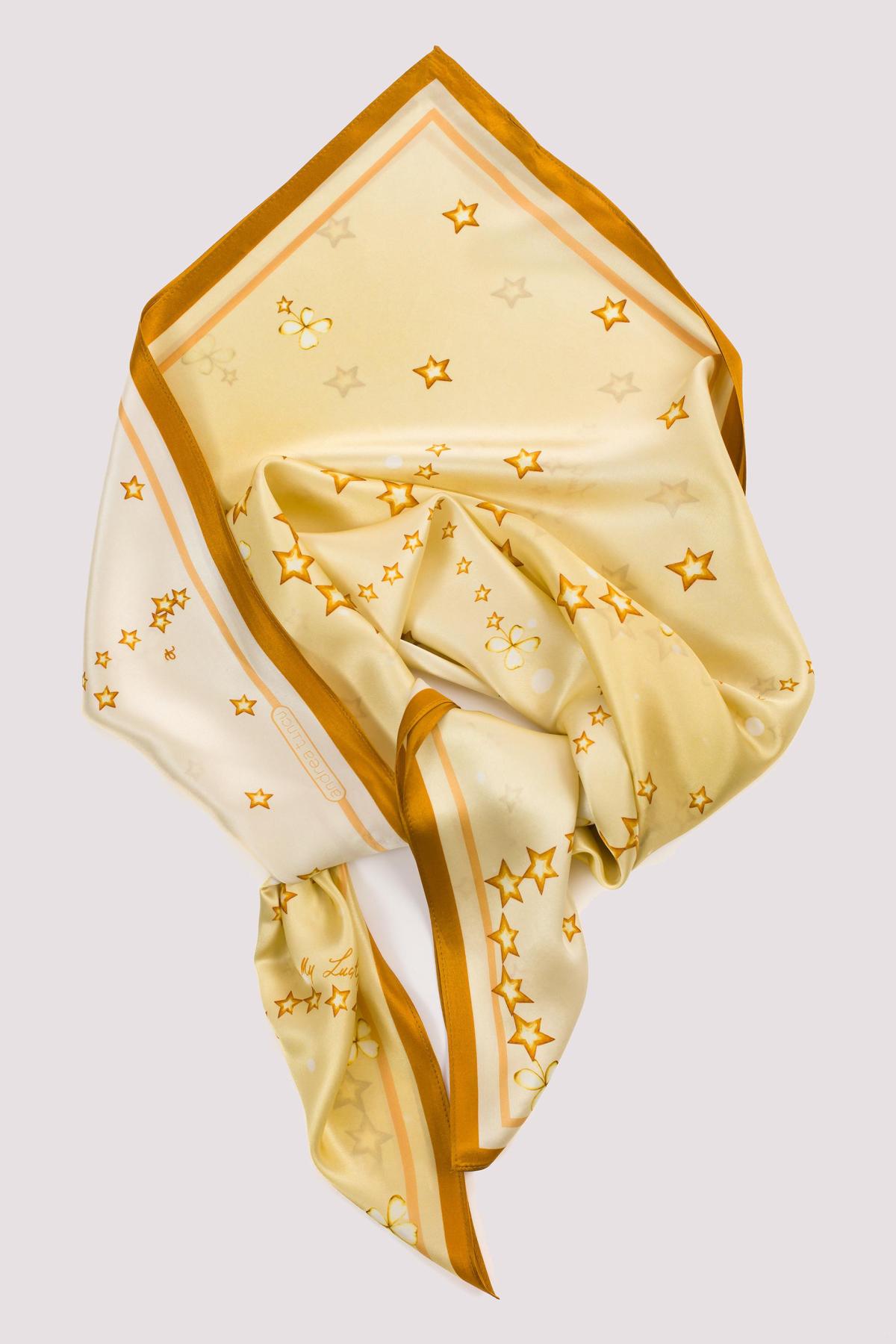 My Lucky Star este un talisman pe matase, construit in jurul stralucirii magnetice stelor aurii. In centrul sau, cuvintele Lucky Girl transforma compozitia intr-un simbol personal – un talisman pe care il poti purta. Stelele simbolizeaza linistita si increderea cuiva care stie ca norocul se revendica, nu se asteapta. Lucrarea a fost realizata manual in acrilic pe panza, apoi rafinata digital si imprimata pe matase, pastrand fiecare detaliu luminos. Fiecare esarfa este livrata in cutie neagra personalizata si ambalata in hartie aurie de matase.La cerere, se poate adauga felicitare si se poate imprima cu numele sau initialele dorite.
