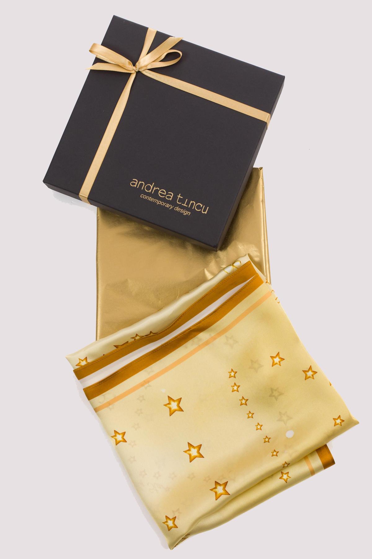 Fiecare eșarfă Andrea Tincu este ambalată în hârtie aurie de mătase și cutie luxury, personalizată cu numele brandului. După ce vă introduceți datele de livrare, puteți opta pentru felicitare cu mesaj scris manual de noi în alb sau personalizată cu inițialele dorite.