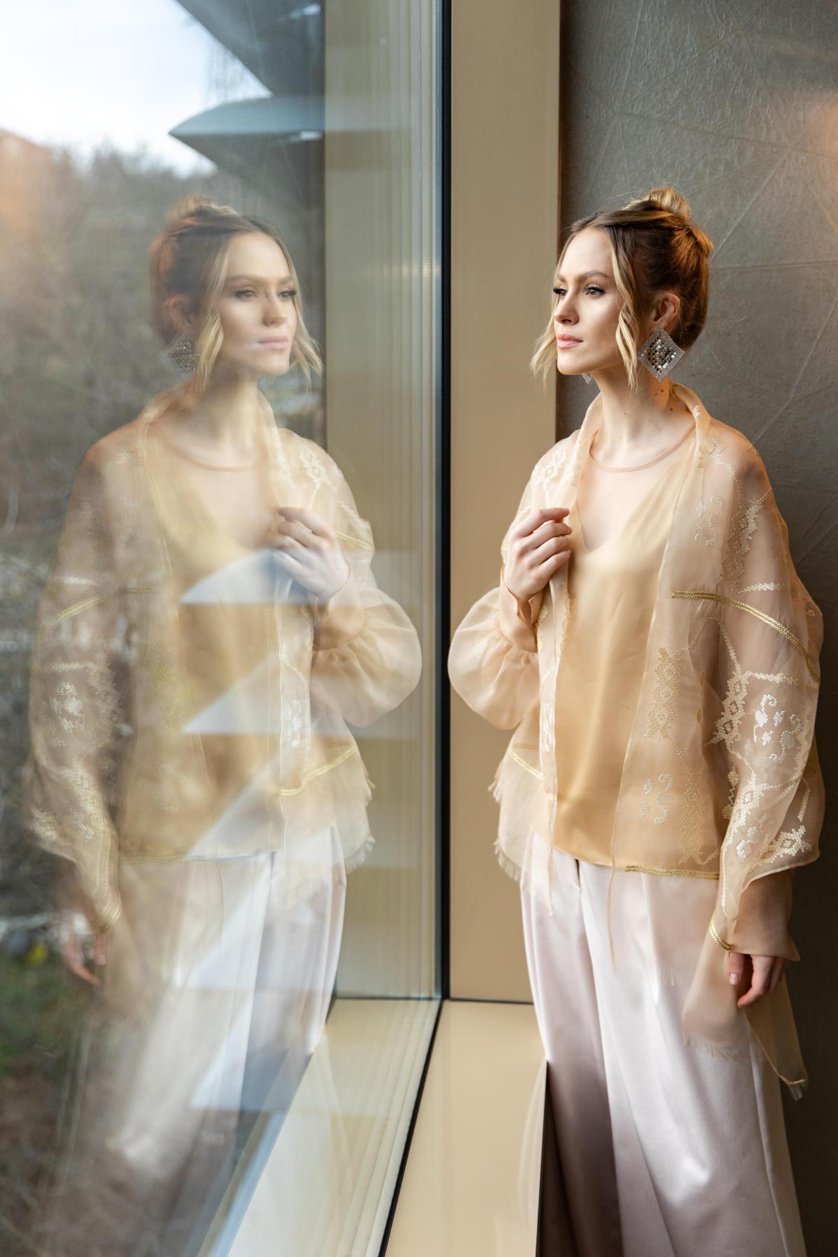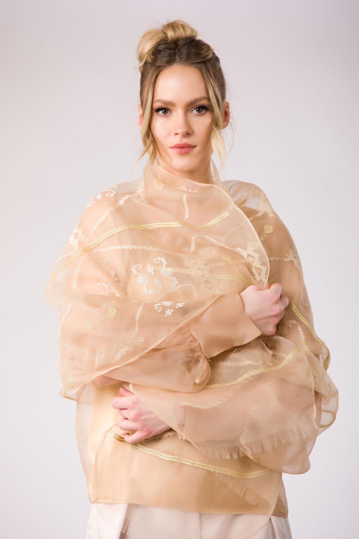 Naframa din organza de matase „Maria de Muscel” este realizată din organza fină de mătase naturală, cusută cu fir de mătase, și este inspirată de marama purtată de Regina Maria a României.Delicată și luminoasă, această piesă reinterpretează tradiția Muscelului într-o formă contemporană, păstrând noblețea, transparența și gestul feminin al vălului regal. Naframa se livreaza in cutie premium de matase si sacosa de brand cadou.
