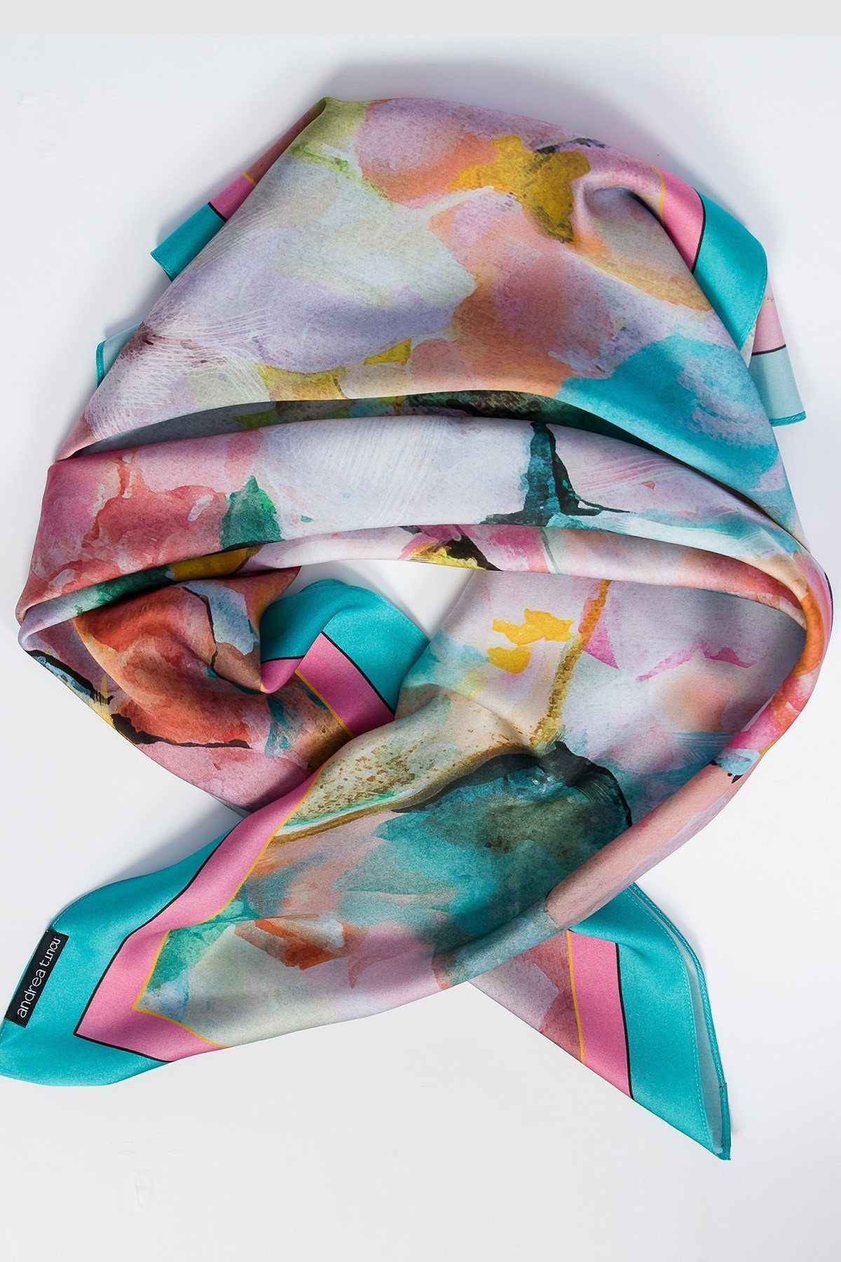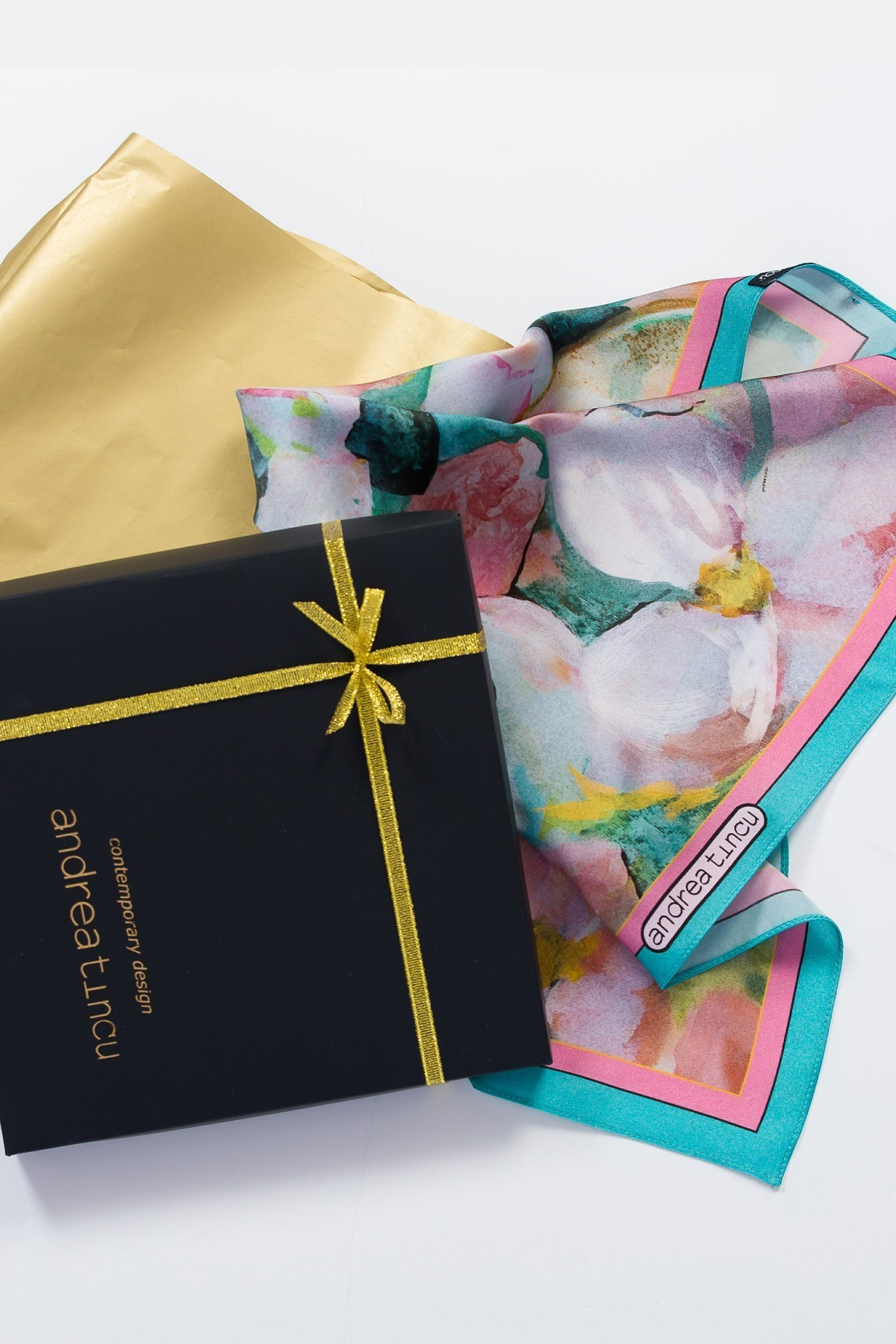 Jeder Andrea Tincu-Schal ist in goldener Seidenpapier und einer Luxusbox verpackt, die mit dem Markennamen personalisiert ist. Nachdem Sie Ihre Lieferdaten eingegeben haben, können Sie sich für eine Grußkarte mit handgeschriebener Nachricht und den gewünschten Initialen entscheiden.