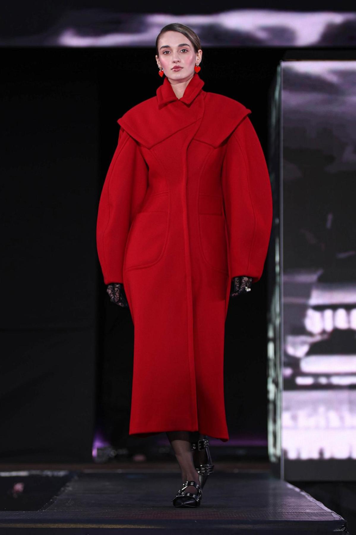 The Buckingham wool coat is a contemporary statement piece, defined by its dramatic silhouette and complex architectural shapes. Wear it with a fitted dress and stiletto heels to highlight its distinctive design.