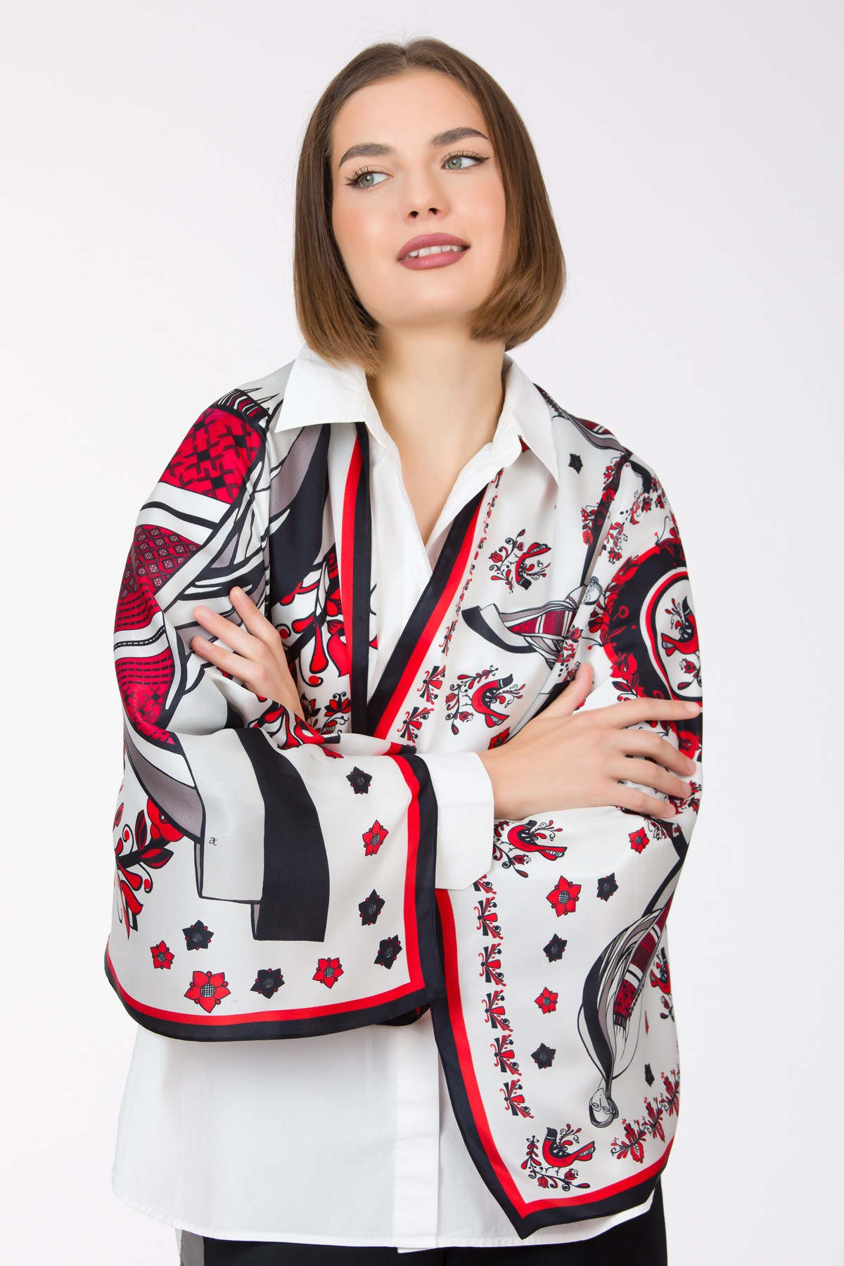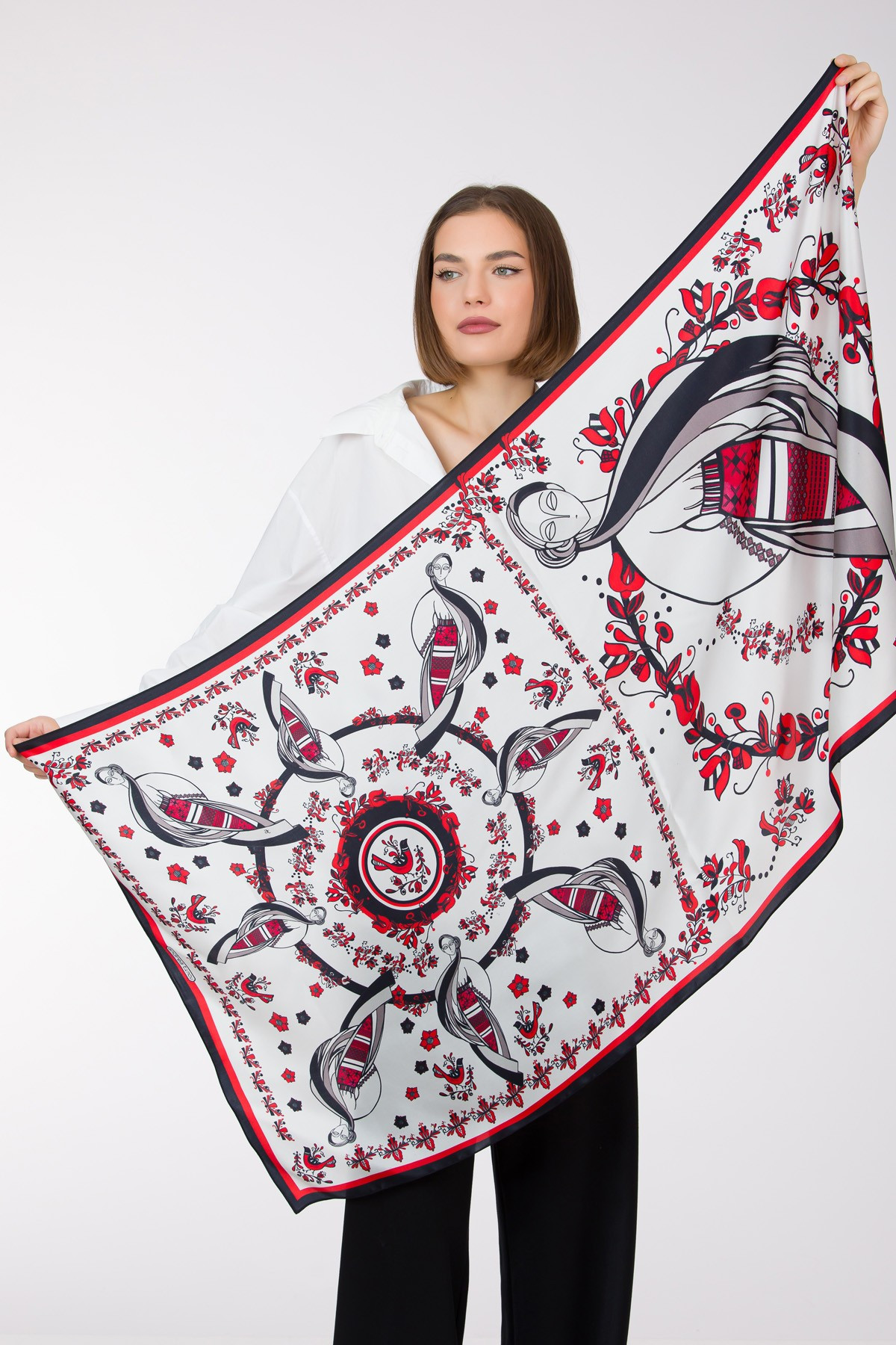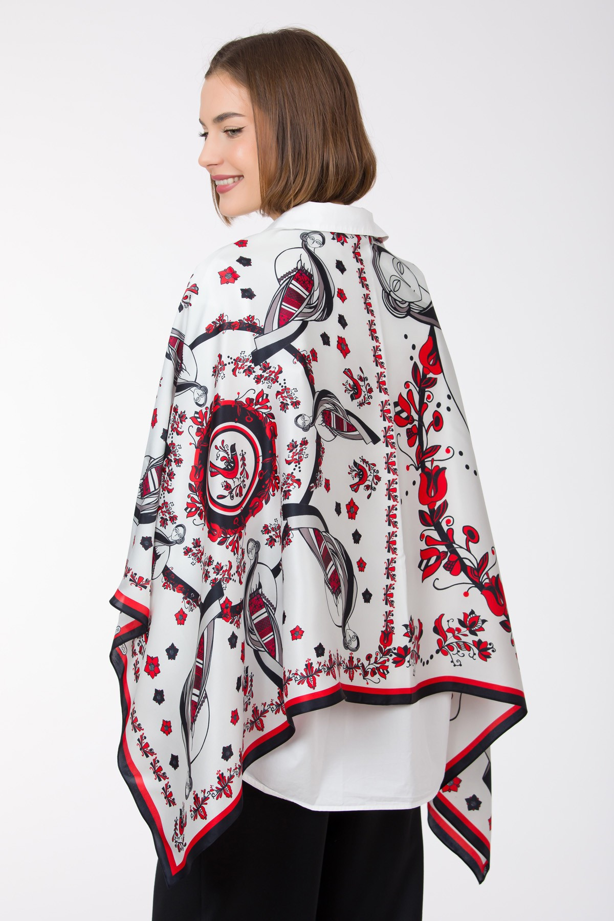 Esarfa Maiastra este potrivita unei femei care este pasionata de Arta si Traditie. Se potriveste perfect cu o camasa alba sau la rochii negre, bej, gri.