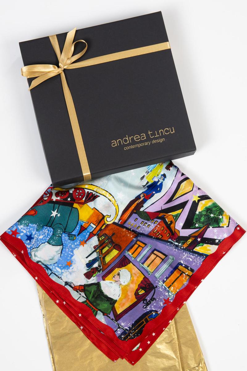 Fiecare eșarfă Andrea Tincu este ambalată în hârtie aurie de mătase și cutie luxury, personalizată cu numele brandului. După ce vă introduceți datele de livrare, puteți opta pentru felicitare cu mesaj scris manual de noi în alb sau personalizată cu inițialele dorite.