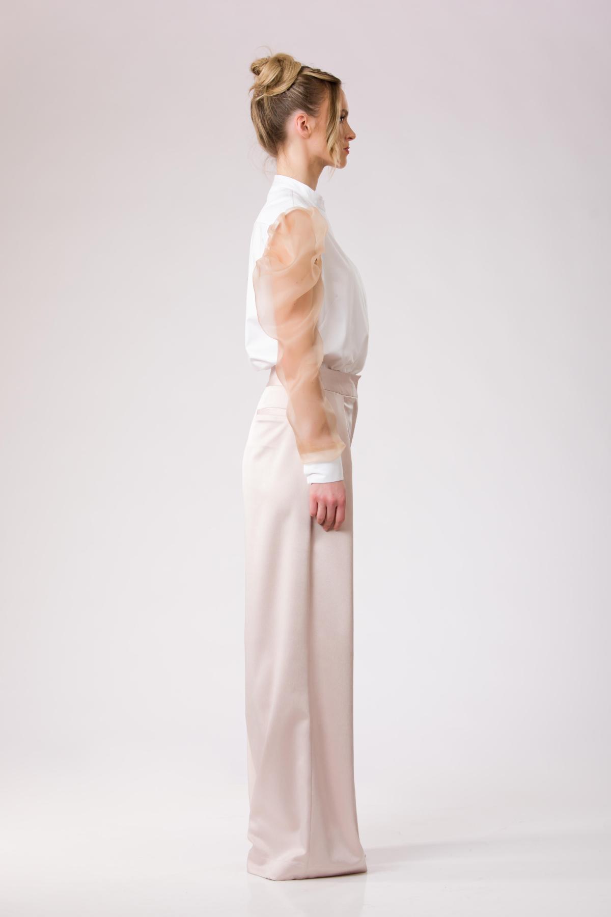 Pantalonii Helena se combina perfect cu bluze din matase, camasi structurate sau topuri minimaliste. Pentru un look inaltat si echilibrat, se recomanda purtarea lor cu incaltaminte cu toc sau platforma fina. Sunt ideali pentru styling-uri monocrome, deoarece alungesc silueta si ofera un aspect couture.