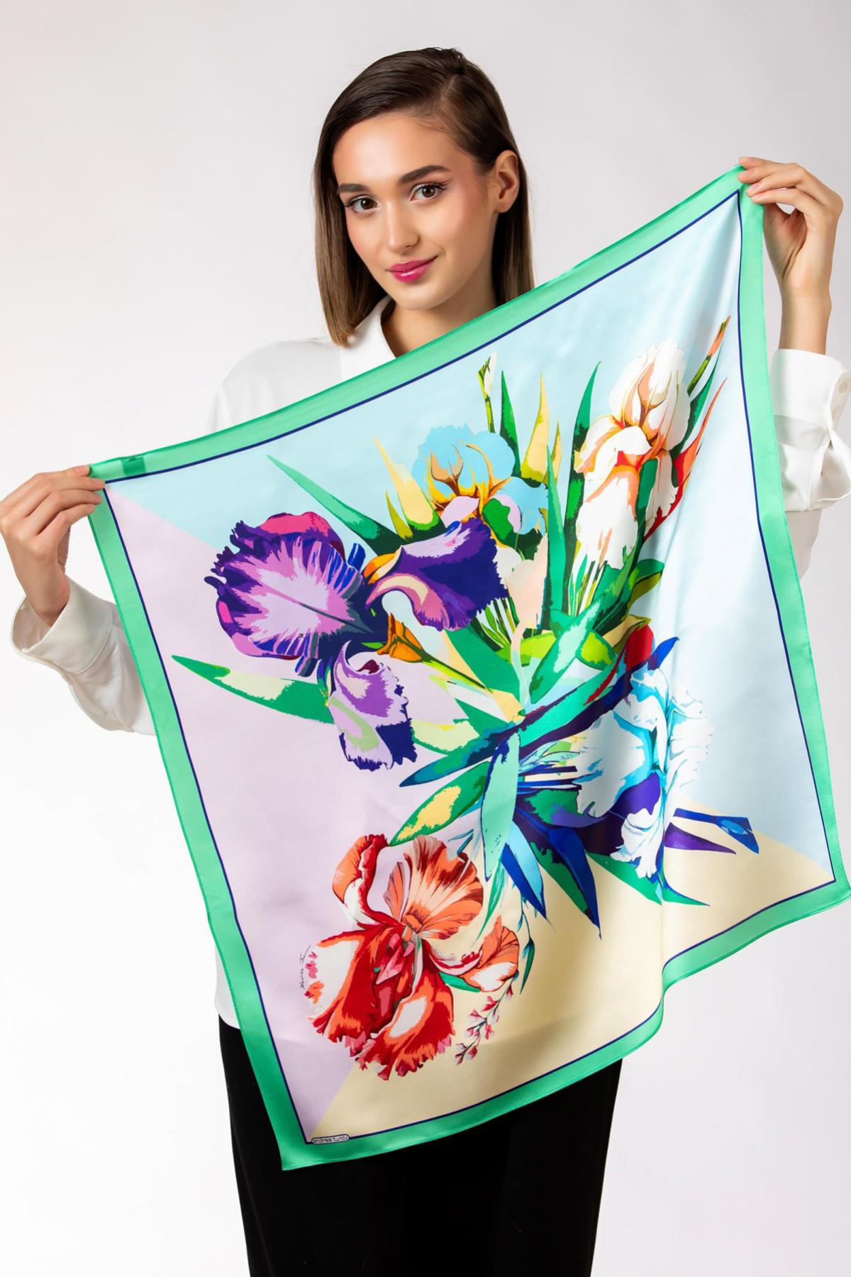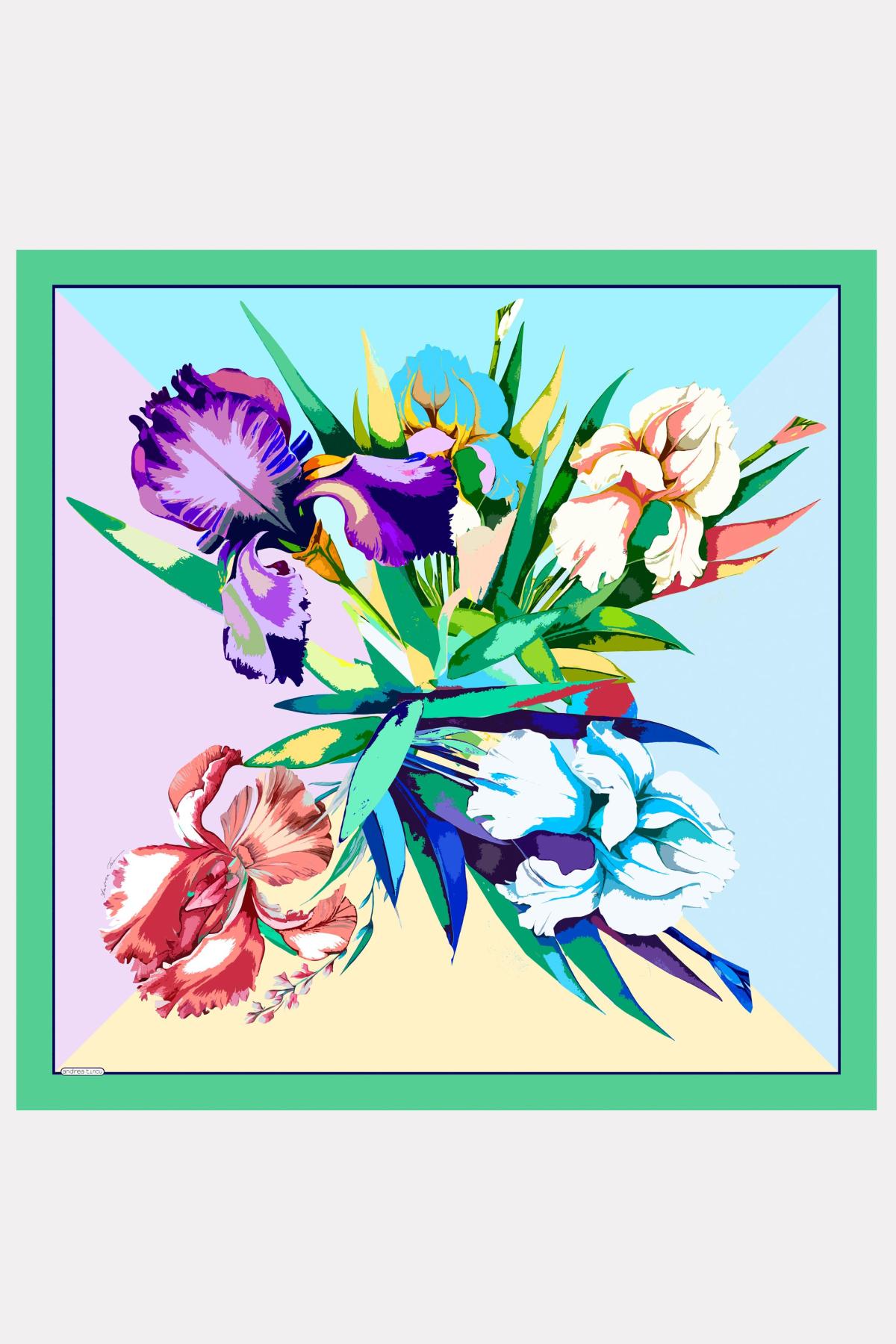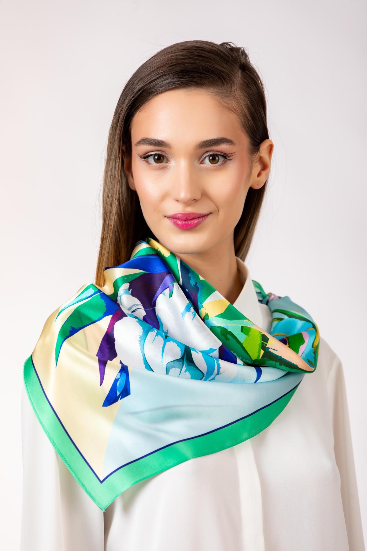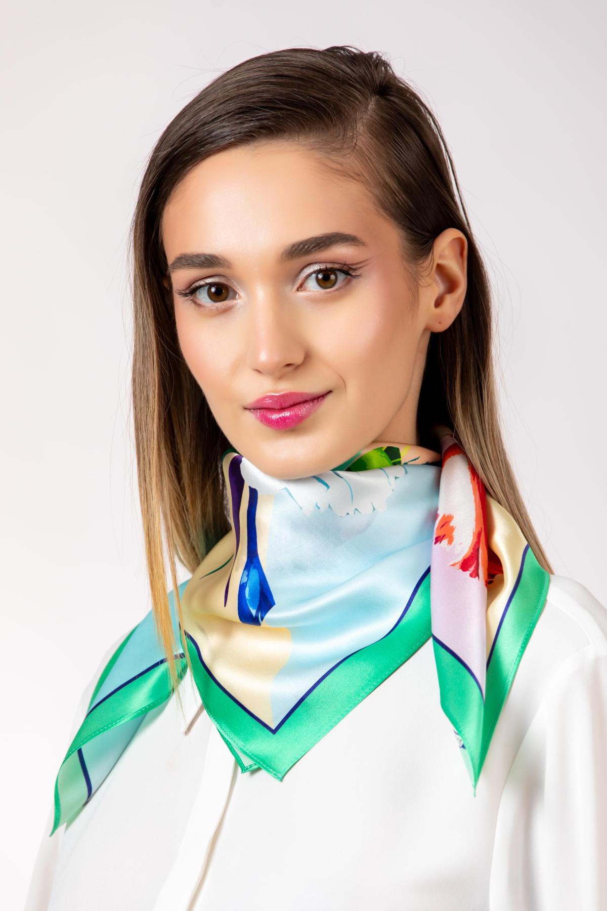 Culorile vii, pastelate, in nuante contrastante, trimit la primavara italiana, la gradinile inflorite ale Toscanei si la explozia de culori a frescelor renascentiste. Tonurile de violet, verde si auriu se impletesc armonios, evocand feminitatea, arta si spiritul liber al Italiei clasice, transformand esarfa intr-o piesa statement, atemporala si plina de poezie.