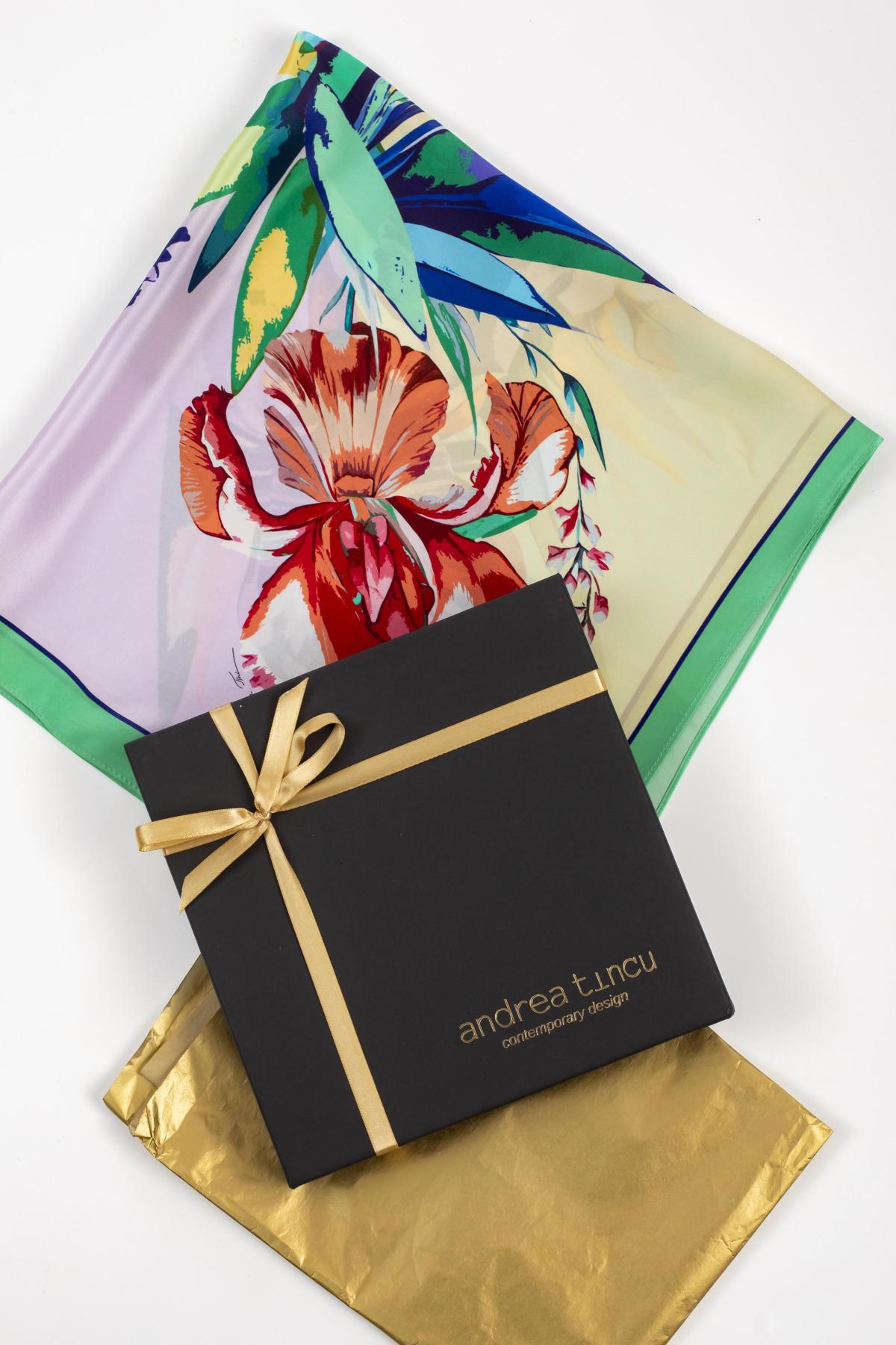 Designul esarfei a fost realizat manual, folosind culori acrilice, apoi prelucrat digital si imprimat pe matase premium. Fiecare piesa este ambalata cu grija in hartie aurie de matase si livrata intr-o cutie eleganta.La cerere, esarfa poate fi personalizata cu numele sau initialele dorite – in acest caz, termenul de livrare se poate prelungi cu pana la 2 zile. Esarfa personalizata se achita in avans, prin OP sau card. Optional, se poate adauga si o felicitare – simpla, alba, sau cu un mesaj scris de mana.