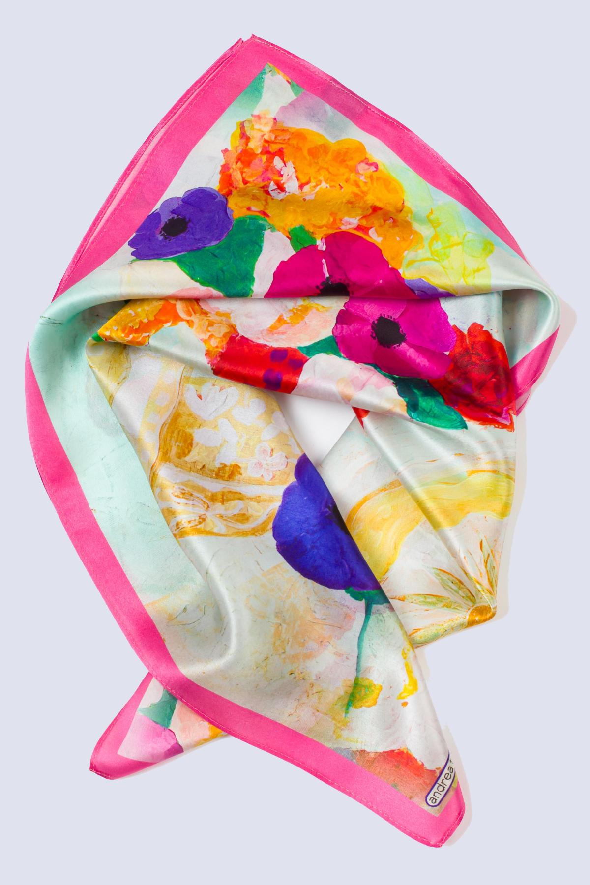 Esarfa Hommage à Luchian este o esarfa din matase naturala inspirata de universul floral al pictorului Stefan Luchian, celebru pentru anemonele si bujorii sai vibranti. Compozitia reuneste anemone intense si bujori generosi, redati in tuse picturale expresive, intr-un joc cromatic sofisticat de rosu, violet, roz si alb, pe un fundal luminos cu accente mint texturate. Florile curg organic pe suprafata matasii, creand un accesoriu artistic statement, elegant si feminin. Vasul ceramic stilizat si farfuria decorativa integrate in design evoca atmosfera naturilor statice clasice, reinterpretate intr-o maniera contemporana. Echilibrul dintre dinamica florala si elementele ceramice transforma aceasta esarfa intr-o piesa cu valoare culturala si estetica. Modelul a fost initial pictat manual de catre Andreea Tincu, in tehnici mixte, apoi prelucrat digital pentru imprimarea pe matase, pastrand textura si energia picturii originale.