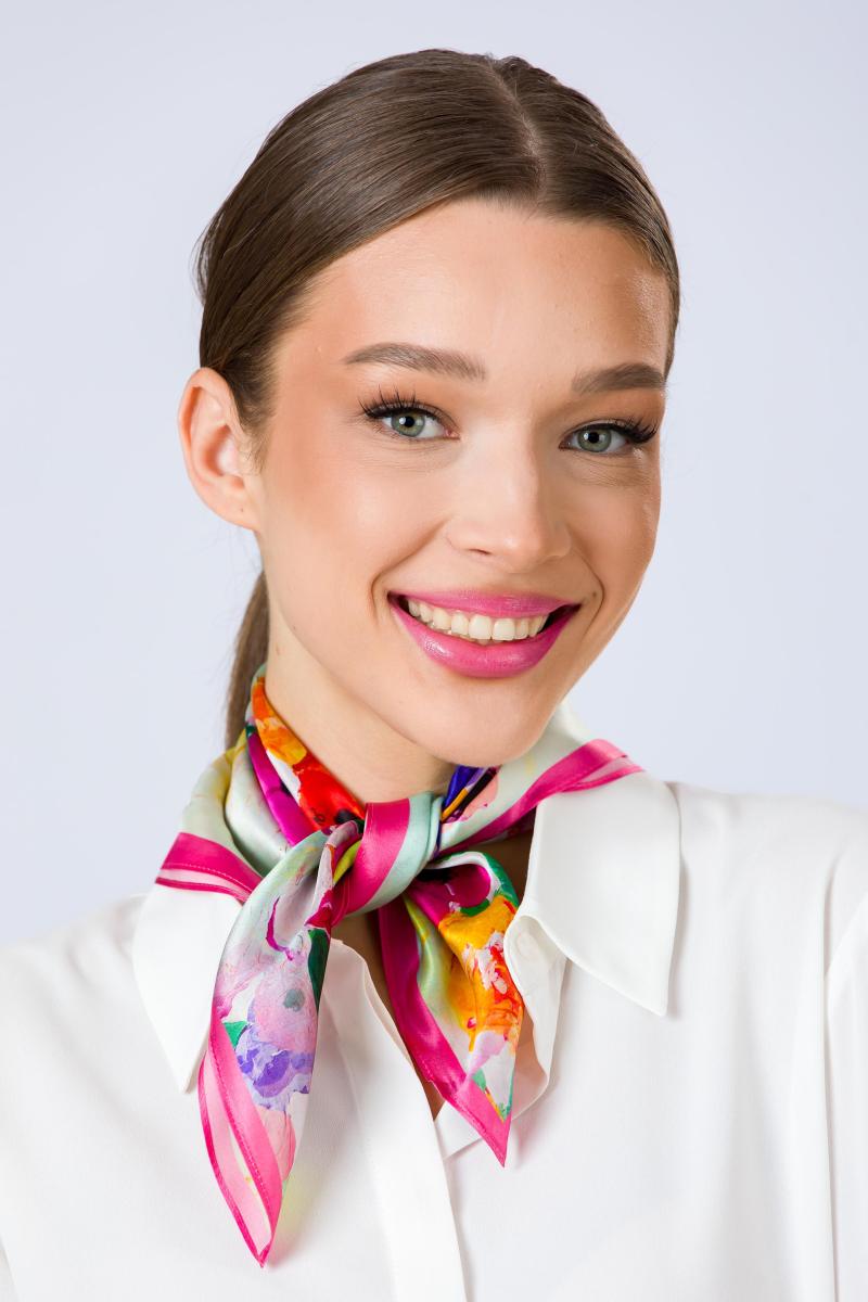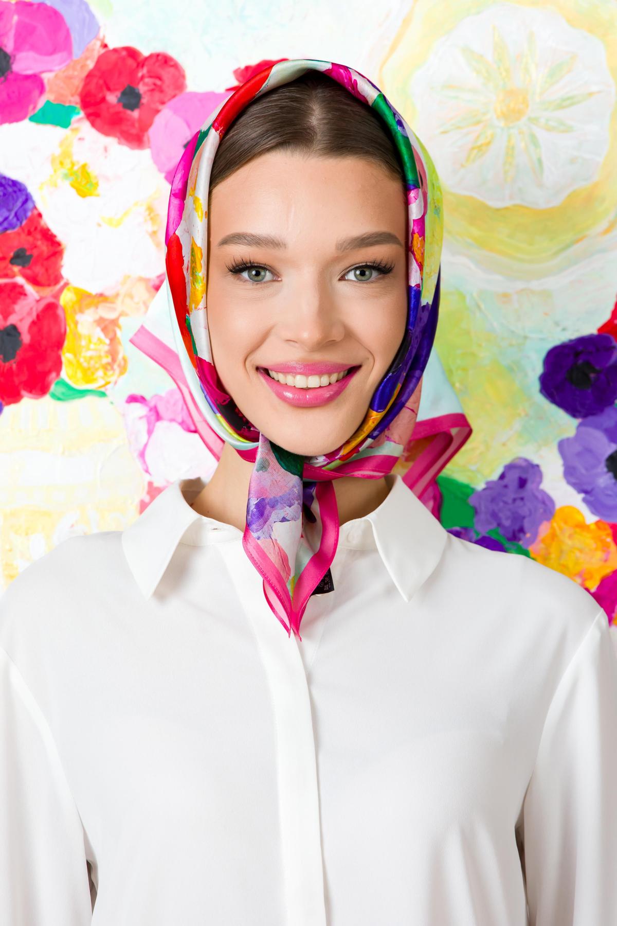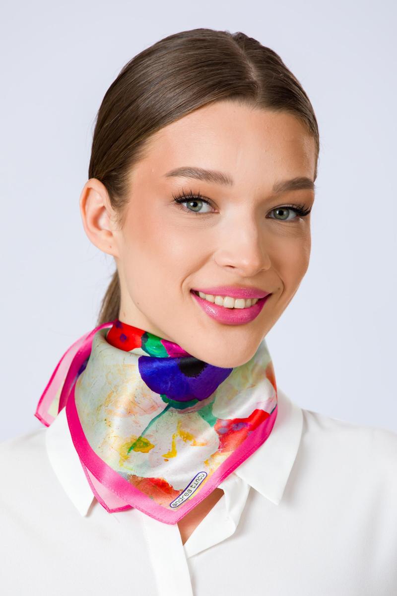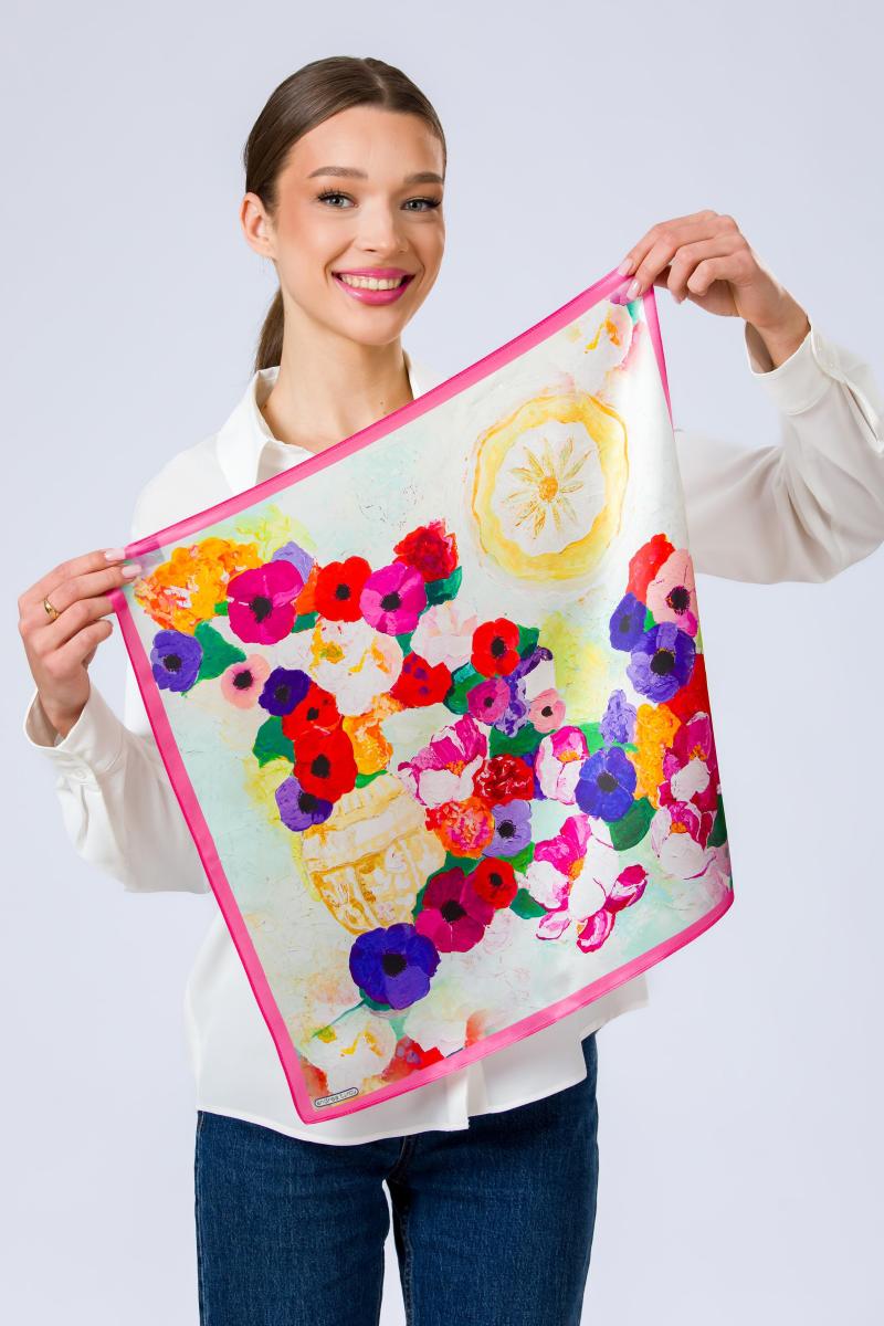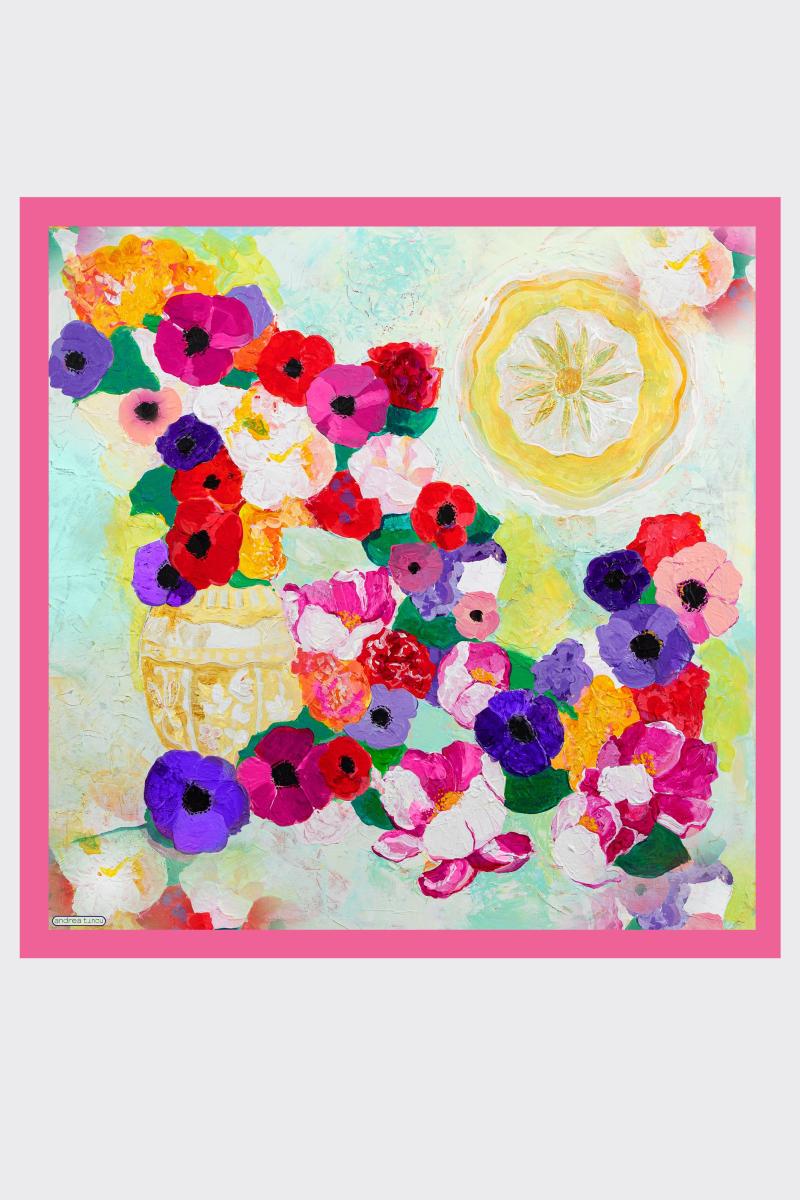 Compozitia reuneste anemone intense si bujori generosi, redati in tuse picturale expresive, intr-un joc cromatic sofisticat de rosu, violet, roz si alb, pe un fundal luminos cu accente mint texturate. Florile curg organic pe suprafata matasii, creand un accesoriu artistic statement, elegant si feminin. Vasul ceramic stilizat si farfuria decorativa integrate in design evoca atmosfera naturilor statice clasice, reinterpretate intr-o maniera contemporana. Echilibrul dintre dinamica florala si elementele ceramice transforma aceasta esarfa intr-o piesa cu valoare culturala si estetica.
