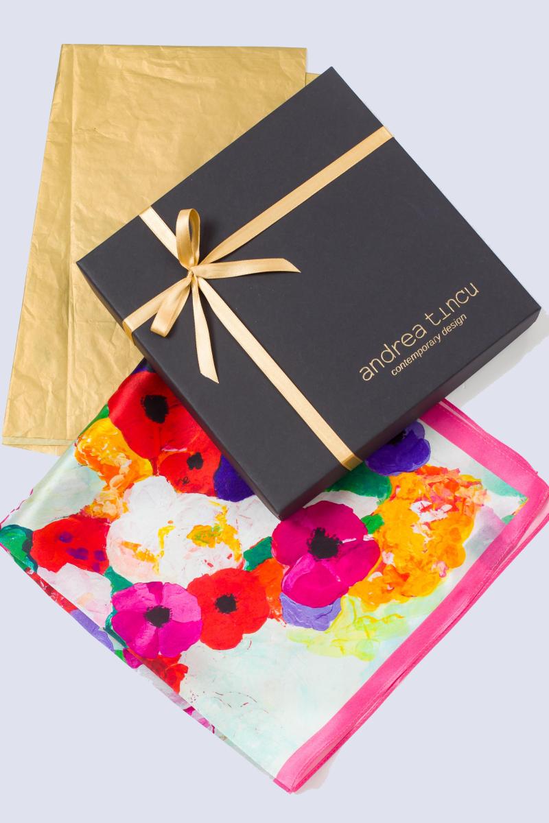Fiecare eșarfă Andrea Tincu este ambalată în hârtie aurie de mătase și cutie luxury, personalizată cu numele brandului. După ce vă introduceți datele de livrare, puteți opta pentru felicitare cu mesaj scris manual de noi în alb sau personalizată cu inițialele dorite.