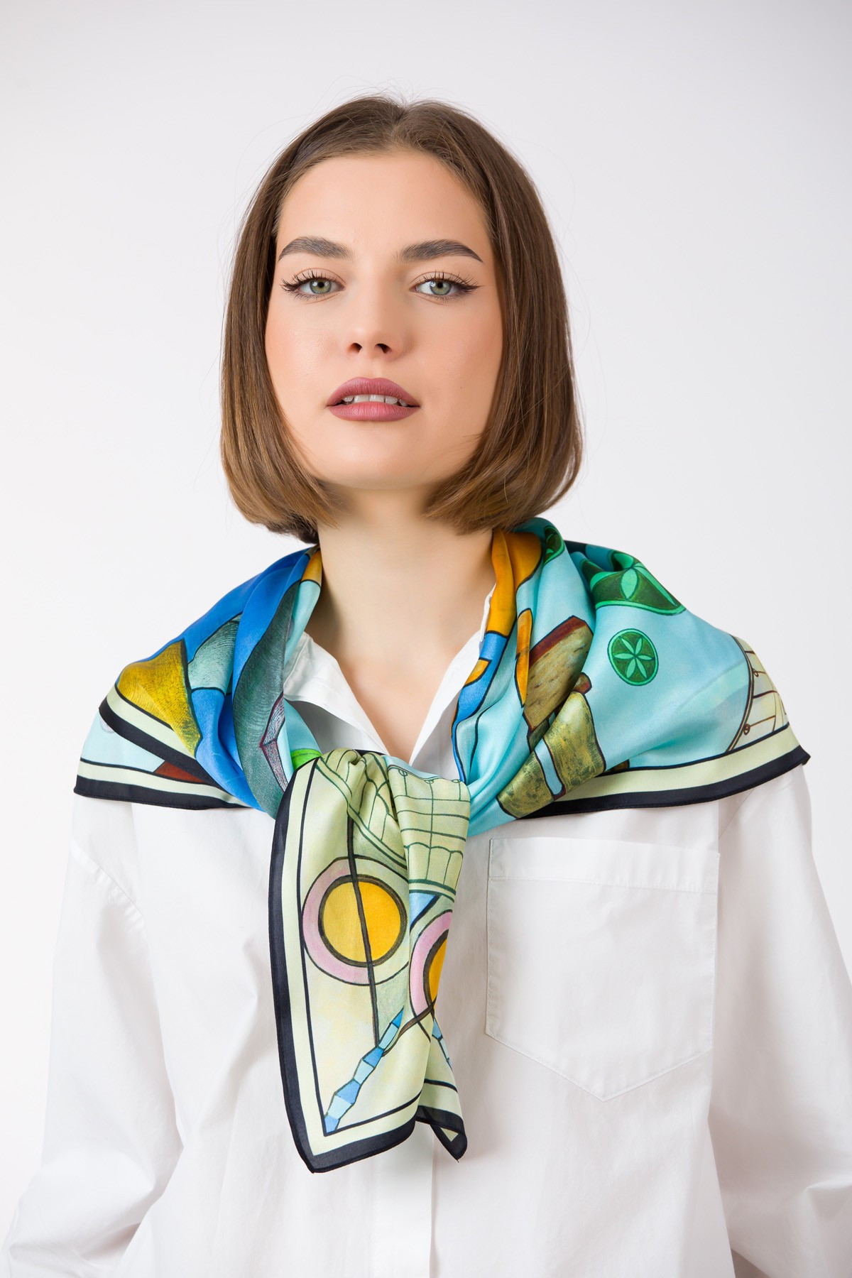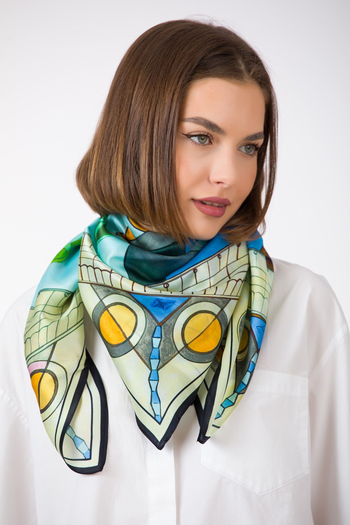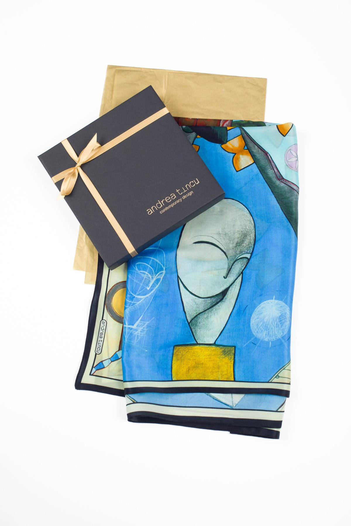 The composition was manually created by designer Andreea Tincu in acrylic colors, then digitally processed and printed on silk. Each scarf is packaged in golden silk paper and a premium box.