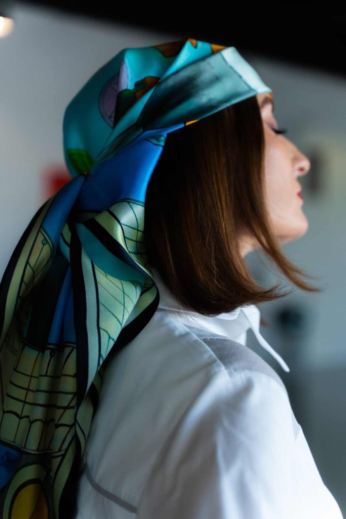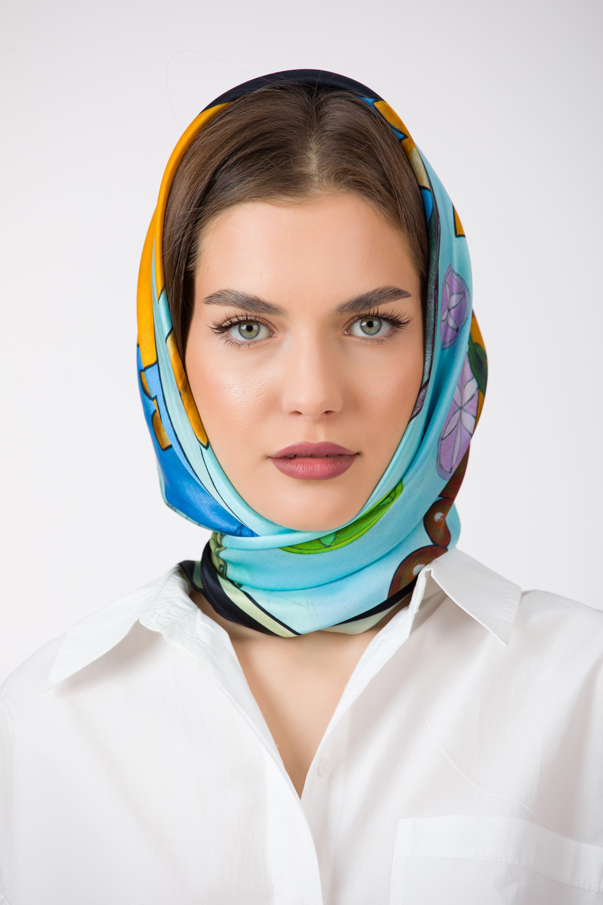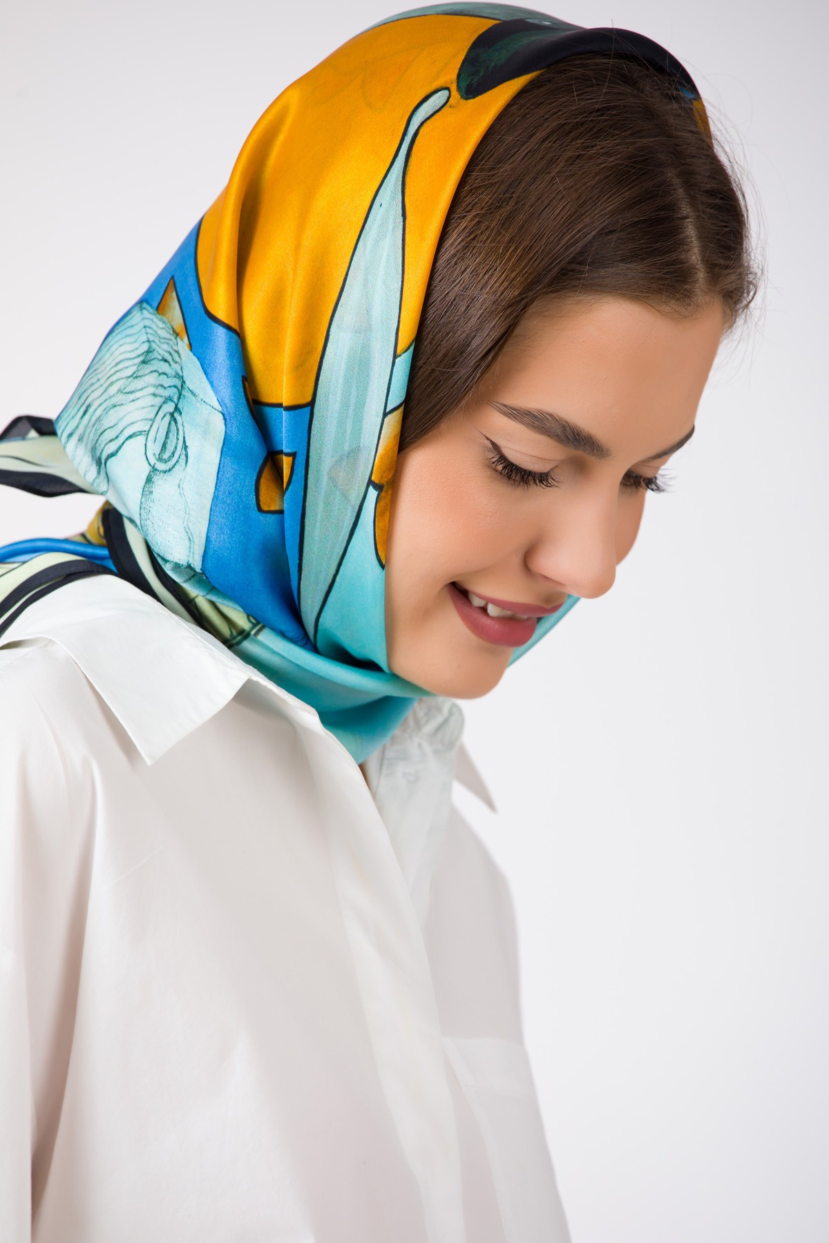 The composition was manually created by designer Andreea Tincu in acrylic colors, then digitally processed and printed on silk. Each scarf is packaged in golden silk paper and a premium box.