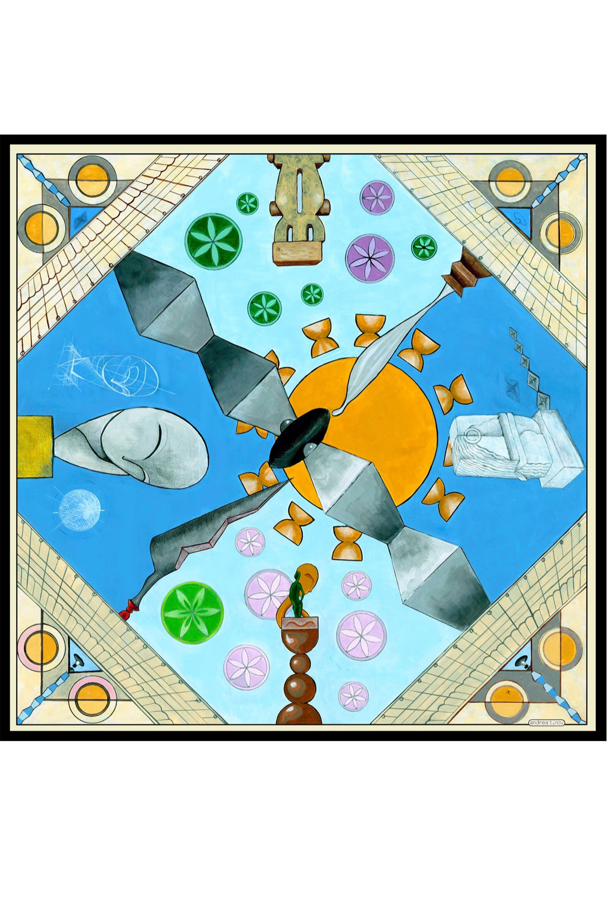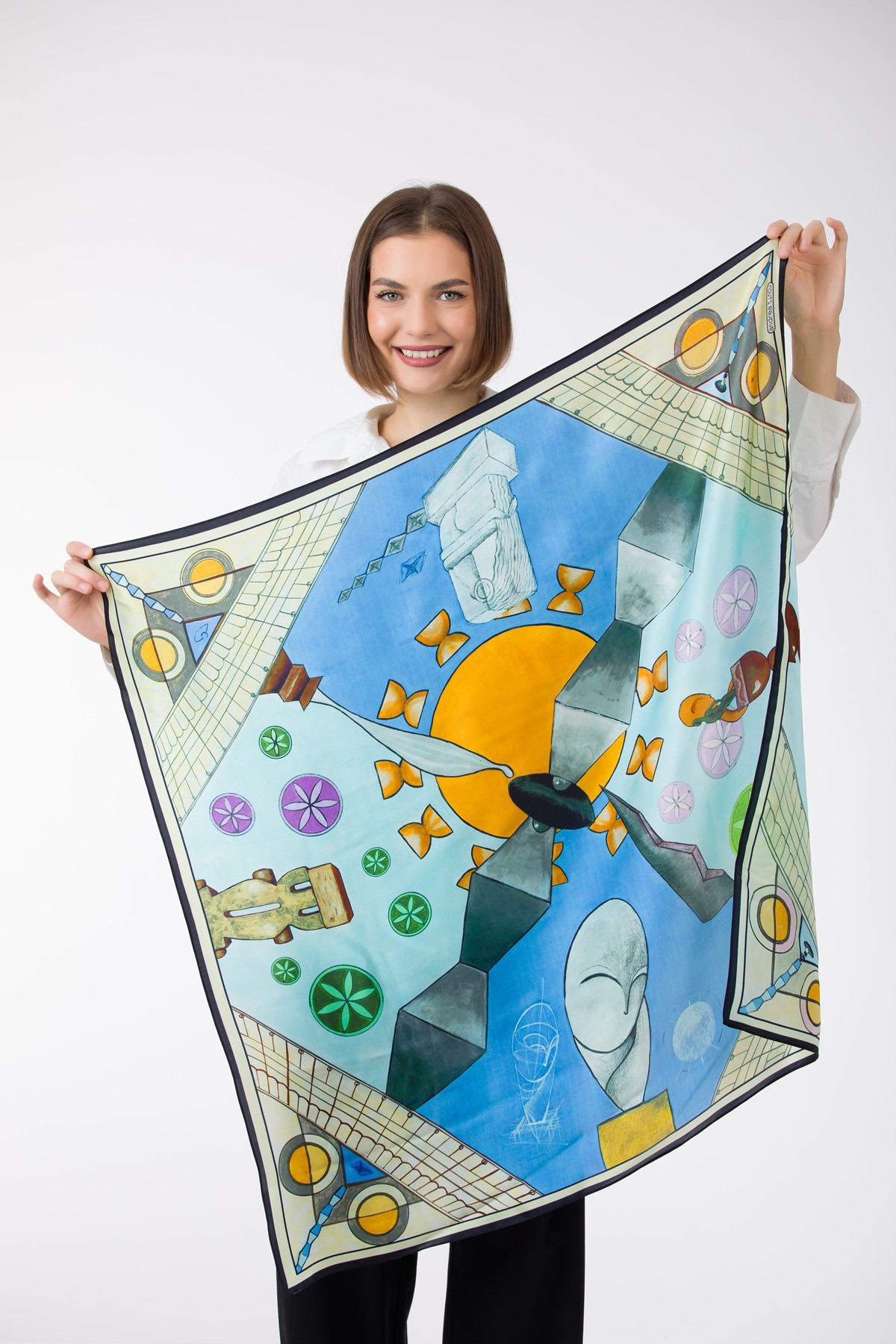 The graphics of the "Hommage a Brancusi" scarf are intricate, with pictorial interpretations of Constantin Brancusi's most important works. You will recognize "The Kiss," "The Infinite Column," "The Gate of the Kiss," "The Table of Silence," as well as "Miss Pogany." In addition to the works, graphic interpretations of the sketches that led to the final sculptures are included. The dominant shades of the scarf pay homage to the materials representative of Brancusi – wood, stone, bronze, and marble. These are surrounded by the deep blue of the sky, which represents the artist's ideal, as formulated in the famous quote, "I did not want to sculpt the bird, I wanted to sculpt the flight." (C. Brancusi).