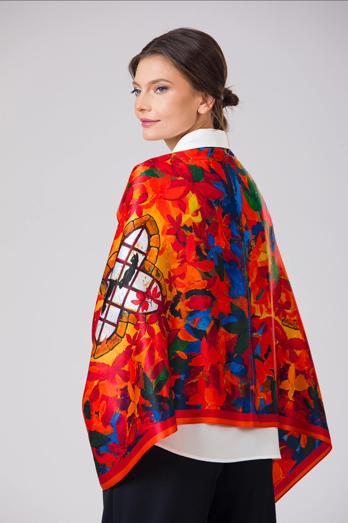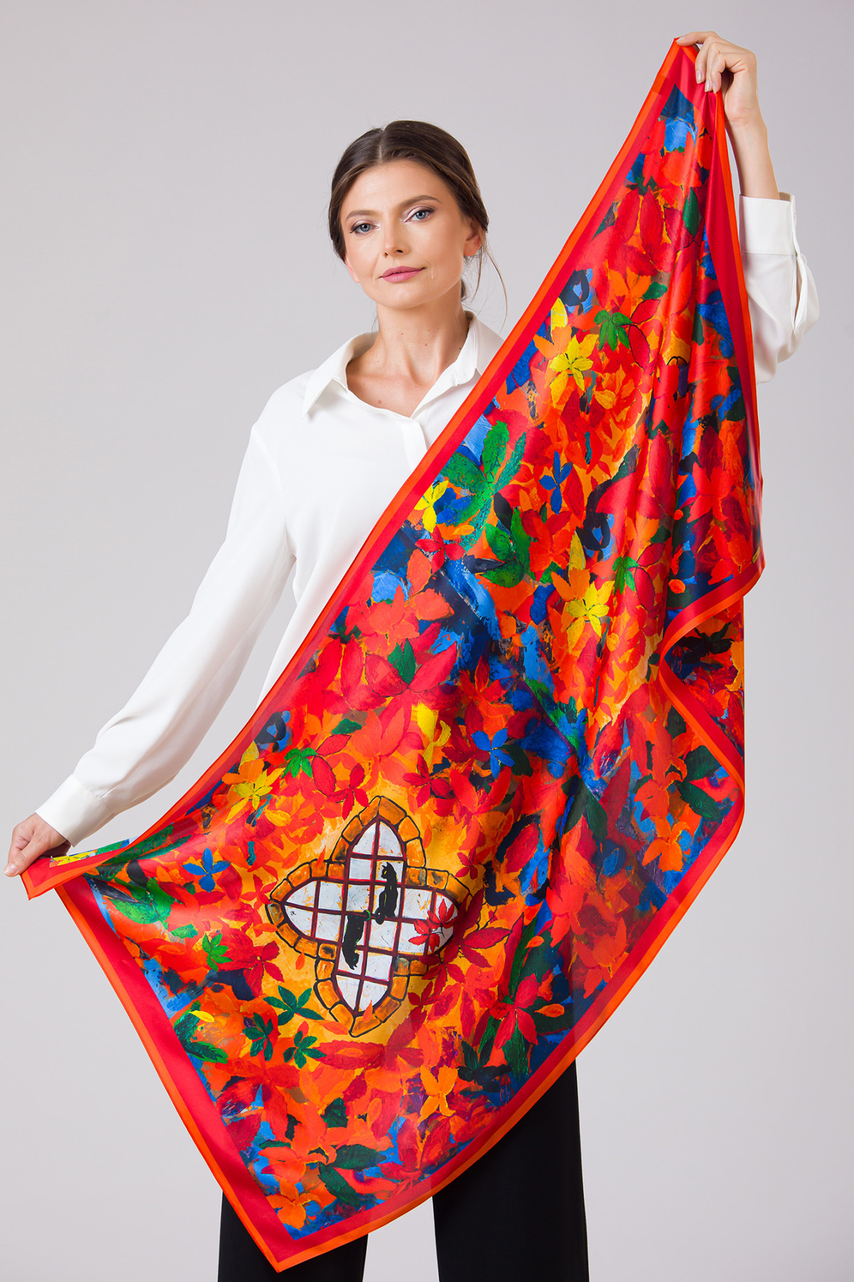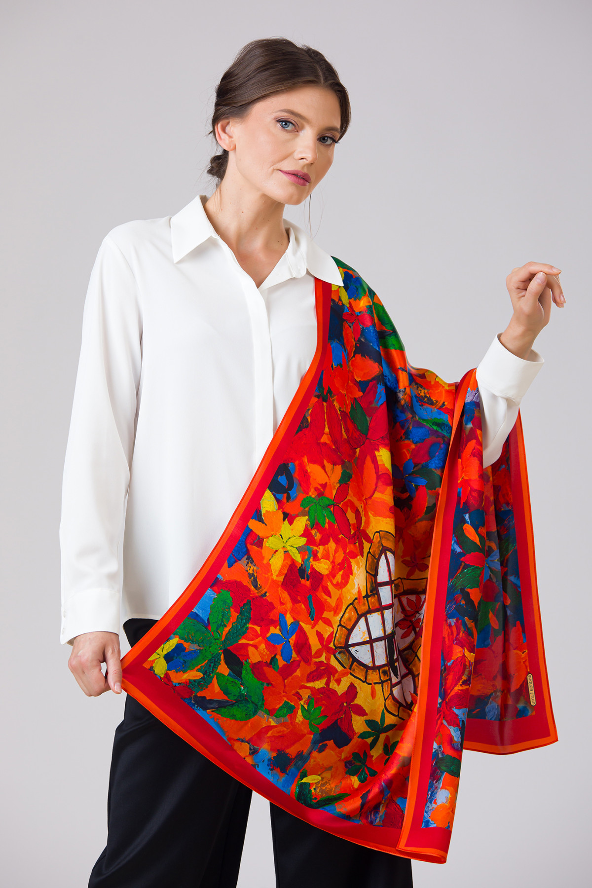 Autumn Twilight Scarf is perfect for elegant women who love autumn and its unique colors. You can pair it with an all-red outfit or together with shades from the print.