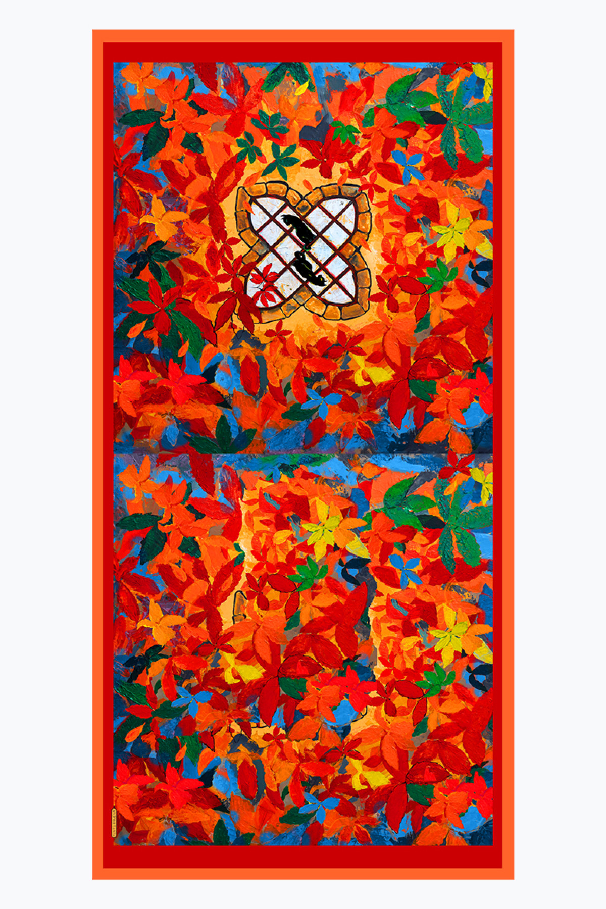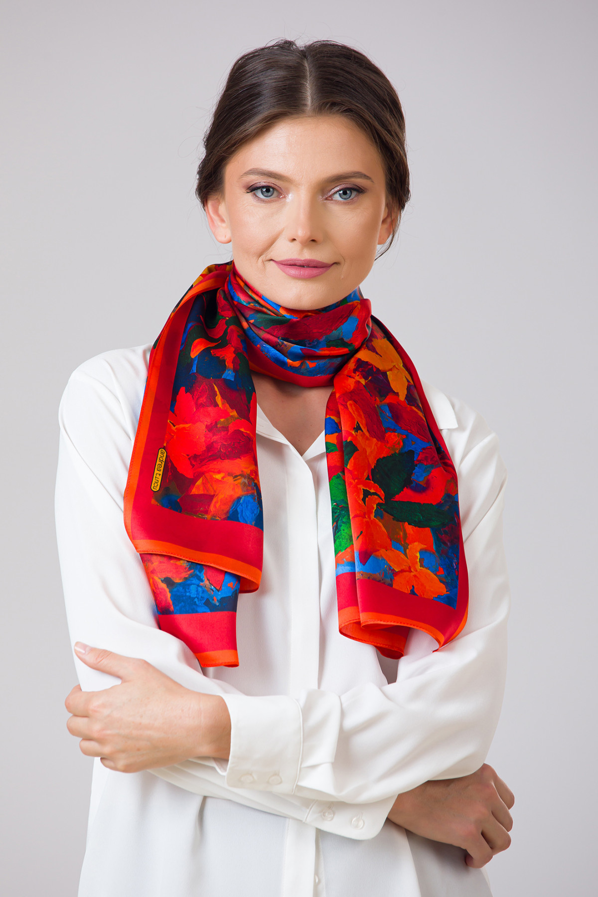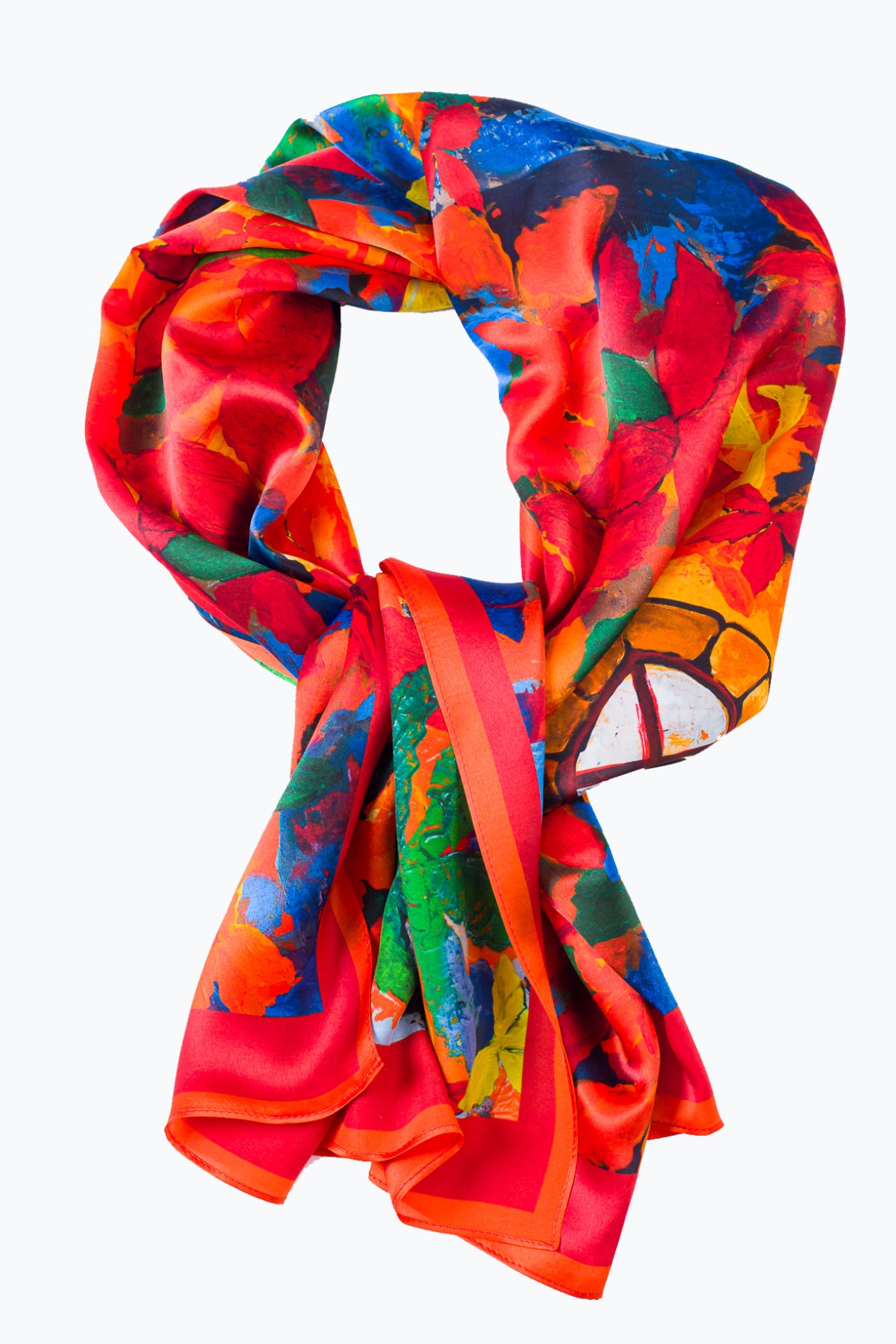 Autumn Twilight Scarf is perfect for elegant women who love autumn and its unique colors. You can pair it with an all-red outfit or together with shades from the print.