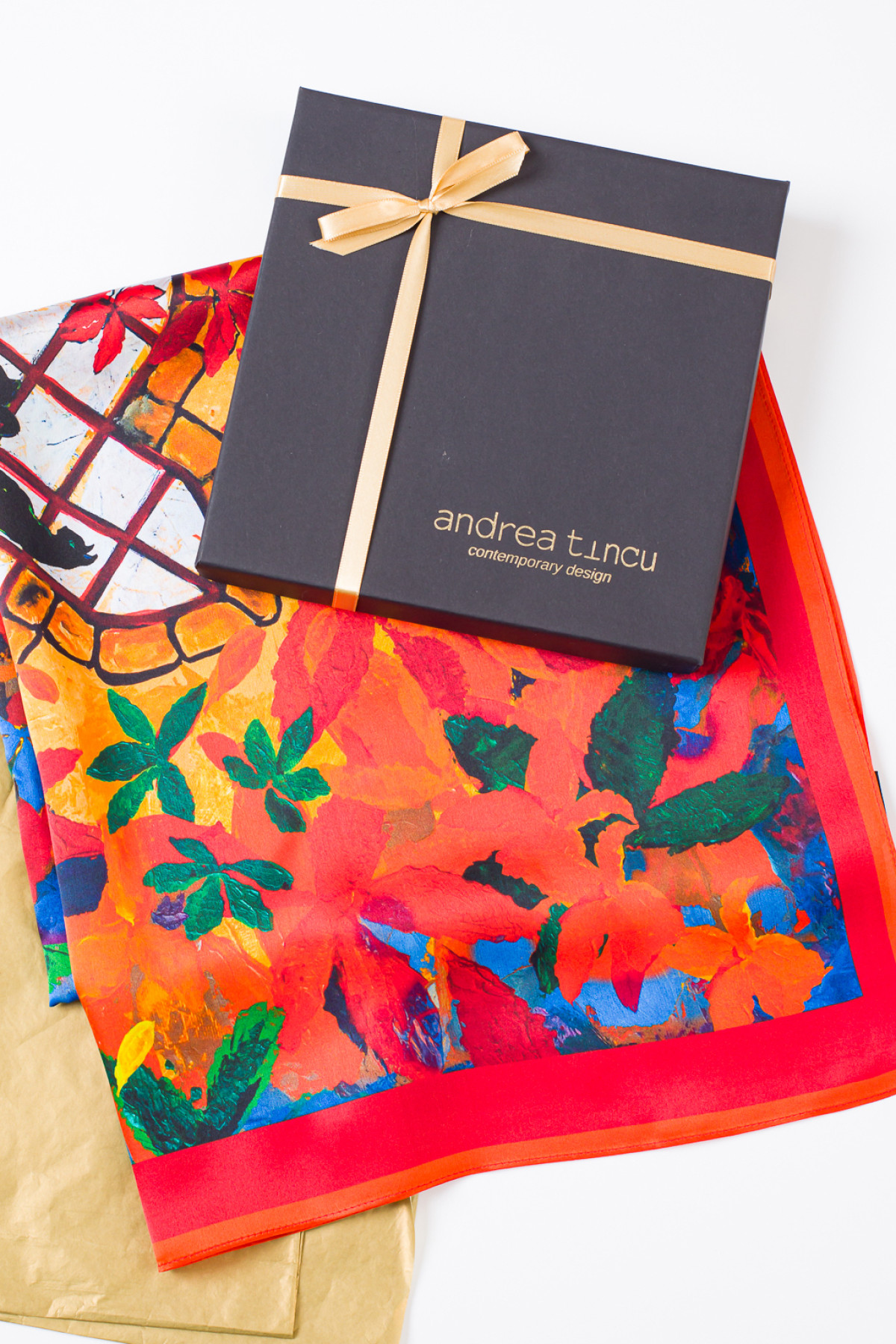 The Autumn Twilight scarf is a fairytale on silk, inspired by the nostalgic beauty of fall days. Amber leaves frame the secret window of the gothic castle, hidden in a birch forest and guarded by two black cats. Designer Andrea Tincu created the composition by hand in acrylic colors on canvas, then digitally processed and printed on silk. Each scarf is packaged in gold silk paper and premium box. Upon request, the scarf can be personalized with the desired name or initials, in which case the delivery time can be modified by 2 days. The personalized scarf can be paid by OP or credit card. You can also opt for a blank or handwritten greeting card.