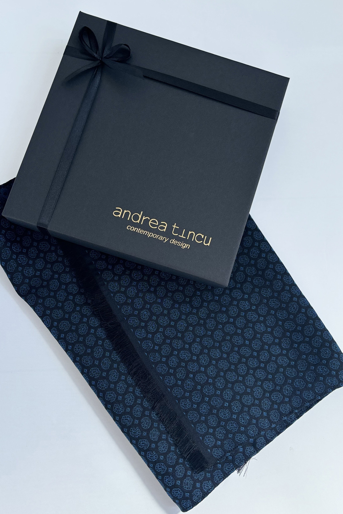 Each Andrea Tincu scarf is packaged in gold silk paper and a luxury box, personalized with the brand name. After entering your delivery details, you can opt for a gift card with a handwritten message and the personalized initials of your choice.