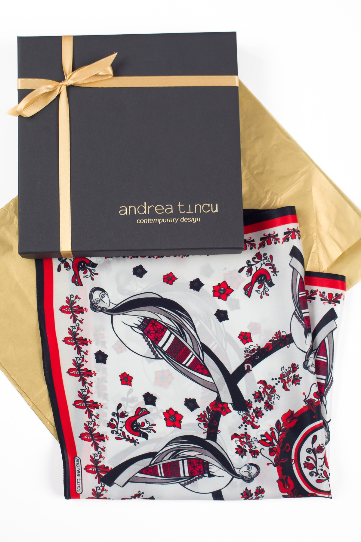 Fiecare eșarfă Andrea Tincu este ambalată în hârtie aurie de mătase și cutie luxury, personalizată cu numele brandului. După ce vă introduceți datele de livrare, puteți opta pentru felicitare cu mesaj scris manual de noi în alb sau personalizată cu inițialele dorite.