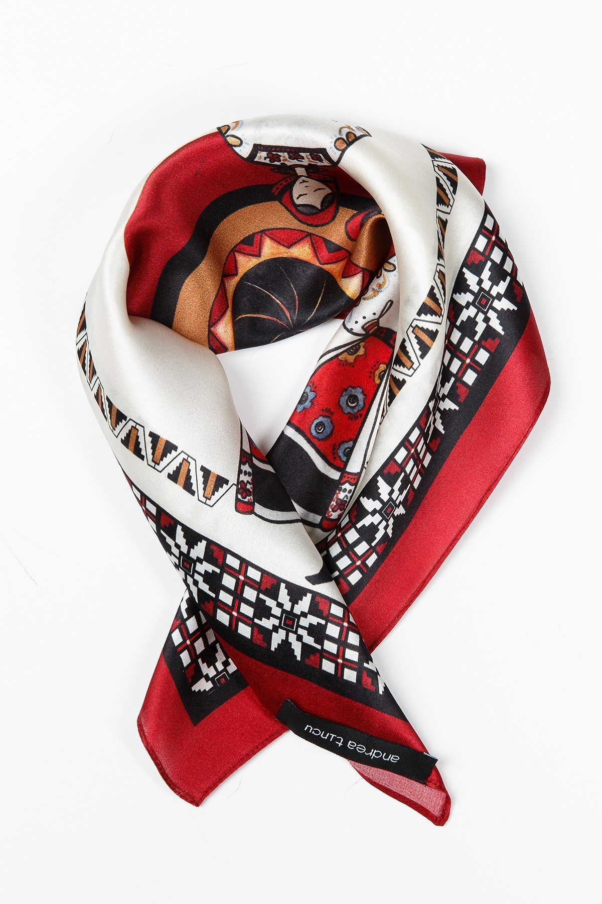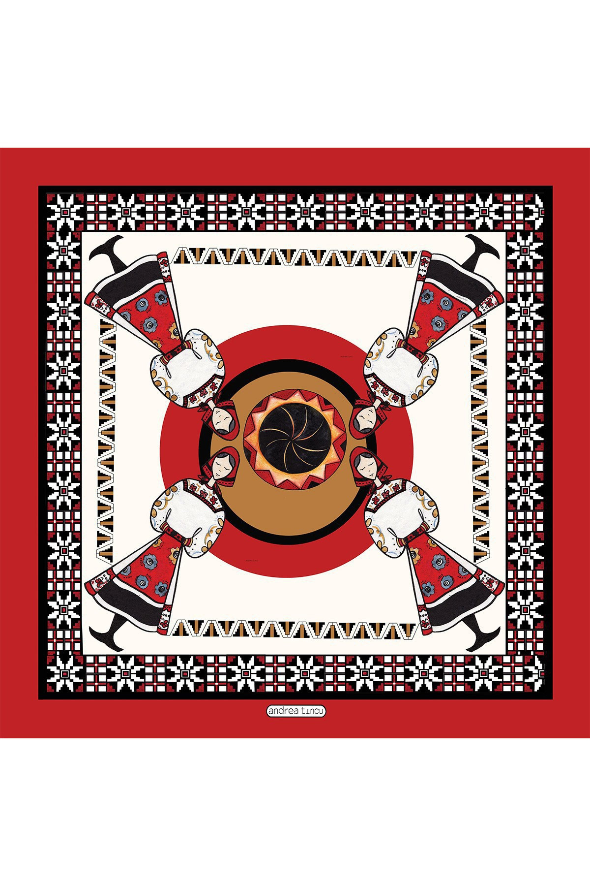 Esarfa este inspirata din elemente traditionale ale costumului popular romanesc. Cromatica este specific portului romanesc, in rosu, alb si negru. Ritmicitatea personajelor este compusa armonios in jurul simbolului central, soarele, in timp ce bordurile decorative reproduc cusaturi populare. Piesa este imprimata si prelucrata pe computer dupa pictura manuala semnata Andreea Tincu. Fiecare esarfa se livreaza ambalata in hartie de matase, intr-o cutie eleganta, personalizata. La cerere, esarfa poate fi imprimata manual cu numele sau initialele dorite. Dimensiuni: 50x50cm