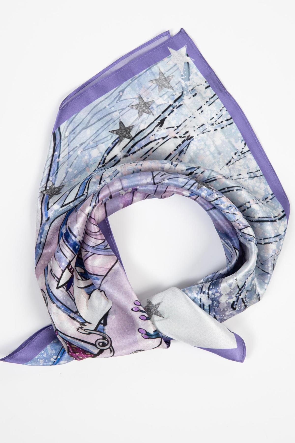 Esarfa Snowy Friends surprinde magia unei paduri acoperite de zapada, unde animalele se aduna intr-o lume pastelata, plina de prietenie si liniste. Ilustratia imbina tonuri de lila, albastru glaciar si roz pudrat, creand atmosfera unui vis de iarna luminat de stelute argintii.