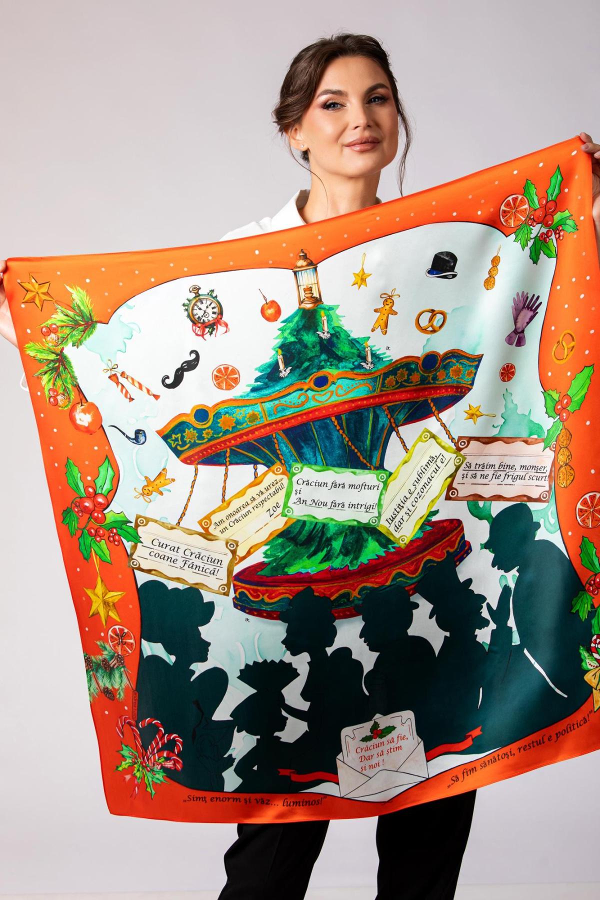 Esarfa Craciun fara Mofturi imbina atmosfera festiva a sarbatorilor cu umorul si energia personajelor lui I.L. Caragiale. In centrul ilustratiei se afla un carusel-brad impodobit, simbol al unui Craciun trait ca un adevarat spectacol, in jurul caruia se strang siluetele unor figuri emblematice: Zita cocheta, monsieur Goe plin de nazuri, Nae Catavencu cu aer important, coana Marioara, domnul Trahanache, dar si alti „onorabili cetateni”, toti surprinsi cu gesturi teatrale si atitudini pline de haz.