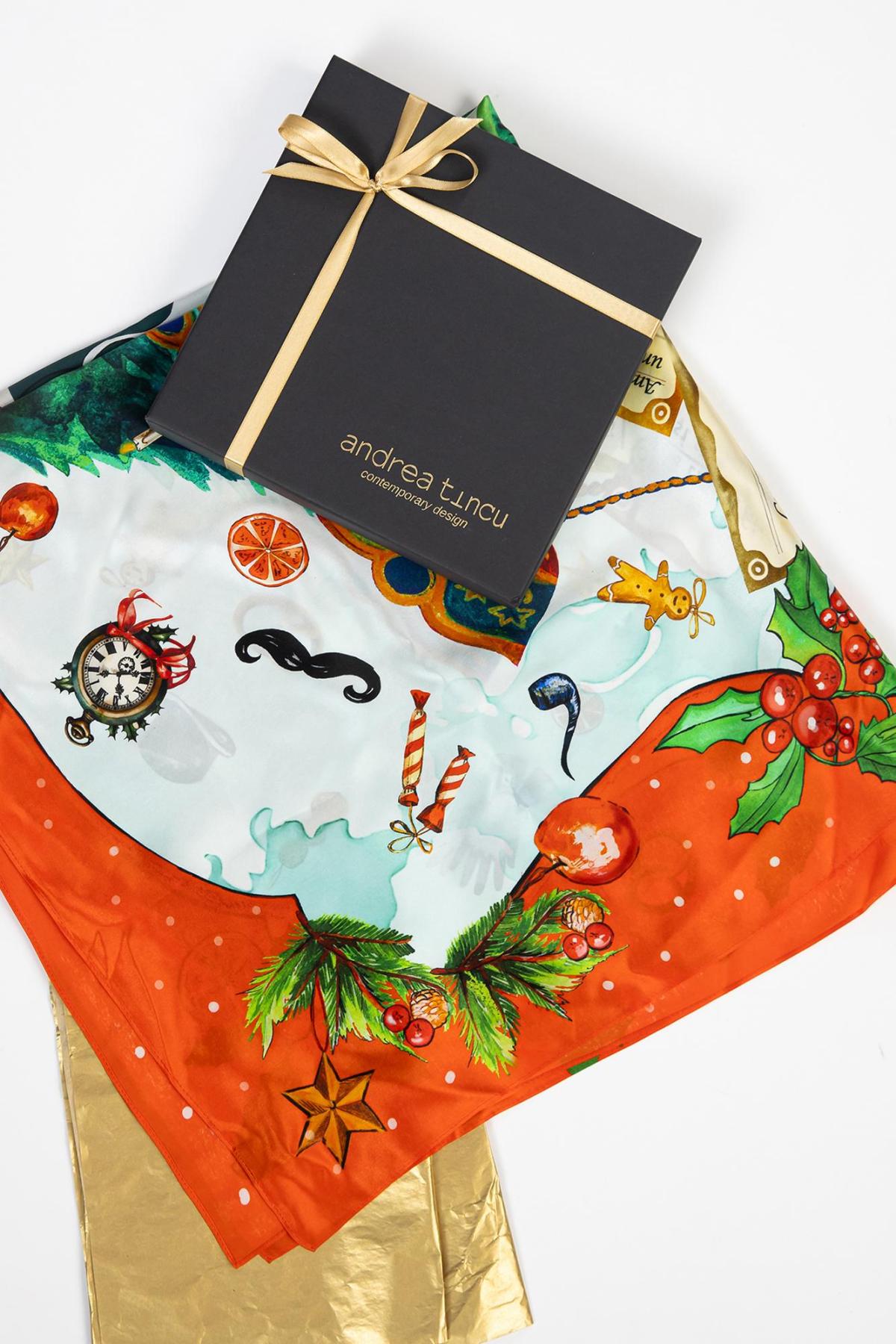 Compozitia a fost realizata intial de designerul Andrea Tincu in acuarele si tus, apoi prelucrata digital si imprimata pe matase premium.Fiecare esarfa este livrata in cutie neagra personalizata si ambalata in hartie aurie de matase.La cerere, se poate adauga felicitare si se poate imprima cu numele sau initialele dorite.