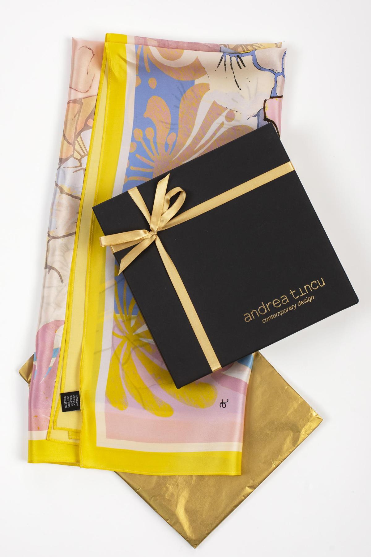 Esarfa se livreaza ambalata in hartie de matase aurie, intr-o cutie eleganta, personalizata. Pentru livrarea in siguranta, cutia de cadou este expediata intr-o cutie obisnuita de carton.