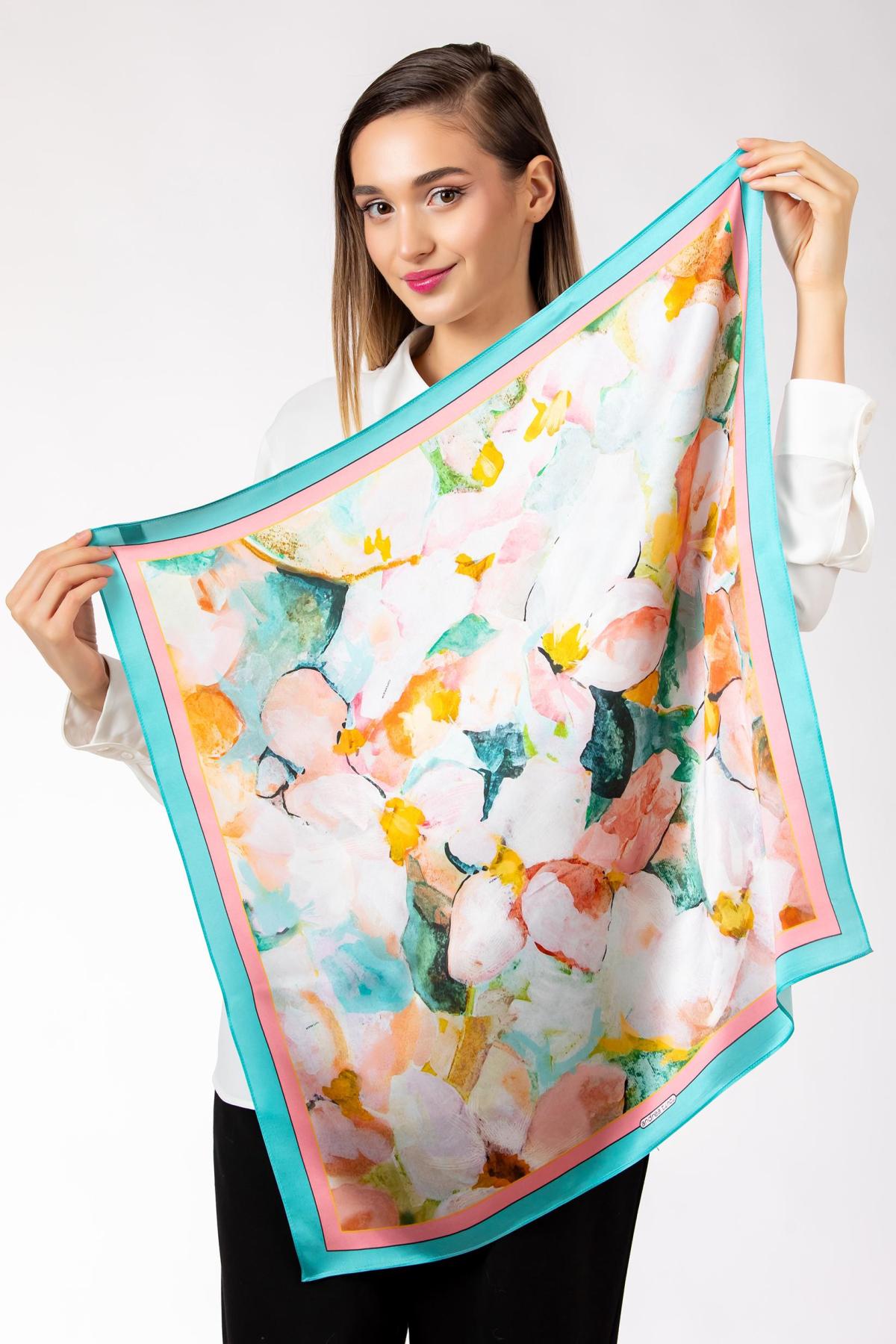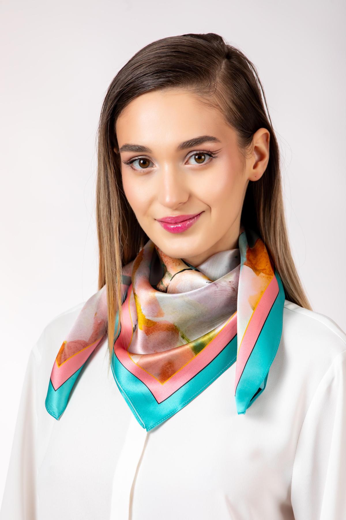 Este o esarfa foarte delicata, in nuante pastelate si luminoase, inspirata de frumusetea desavarsita a magnoliilor.