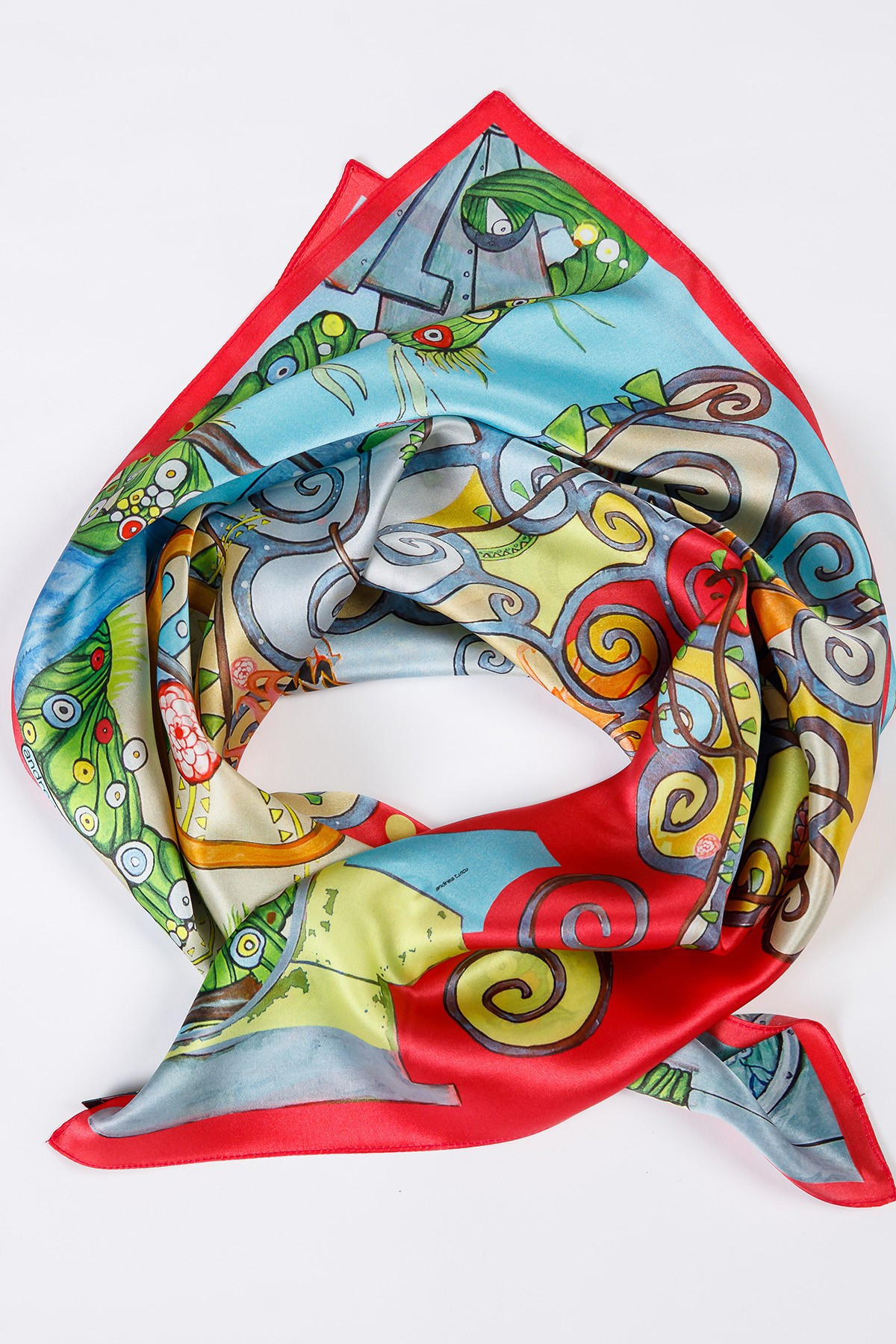 Este o esarfa care te poarta cu gandul la o lume fantastica, aflata in spatele celei reale, intr-o combinatie marina-terestra. Cromatica este o combinatie interesanta de tonuri calde si reci, pusa in evidenta de grafica originala.