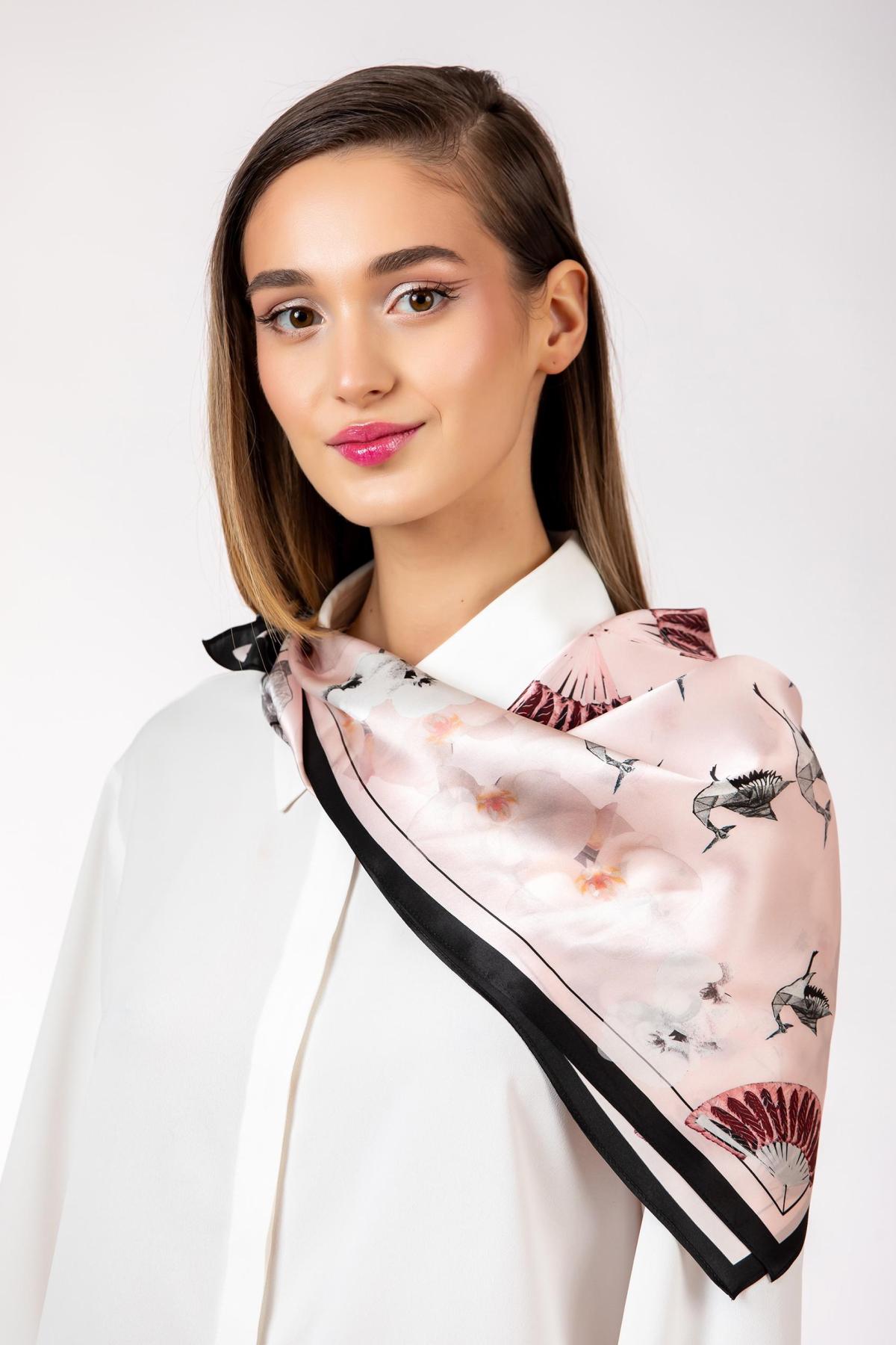 Este o esarfa inspirata de un rasarit delicat de soare, in care pasarile de origami zboara printre orhidee albe si roz pudrat, reprezentate printr-un joc grafic de tuse transparente si valoratie grafica. Datorita simetriei florilor si frunzelor fata de tulpina , orhideea este un simbol al perfectiunii sau al frumusetii desavarsite. Orhideea este o floare de o frumusete magnifica , care poate transmite un mesaj universal de dragoste , intelepciune si credinta.